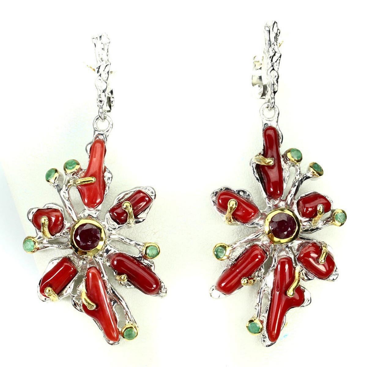 925 STERLING SILVER;PLATE2-TONE WHITE & YELLOW 14K GOLD;MAIN STONECORAL;OTHER GEMSEMERALD,RUBY;TOTAL WEIGHT67.38 CT (TOTAL WEIGHT OF SILVER + STONE)DIMENSION* STONE 2.0 TO 14.0 X 6.0 MM. * FACE EARRINGS 55.0 X 23.0 MM.MAIN STONE SHAPEFANCY CABOCHONMAIN STONE COLORTOP RICH REDCLARITY/GRADEOPAQUELUSTERDELIGHTFULTREATMENTNATURALORIGINITALYHARDNESS3.0 - 5.0