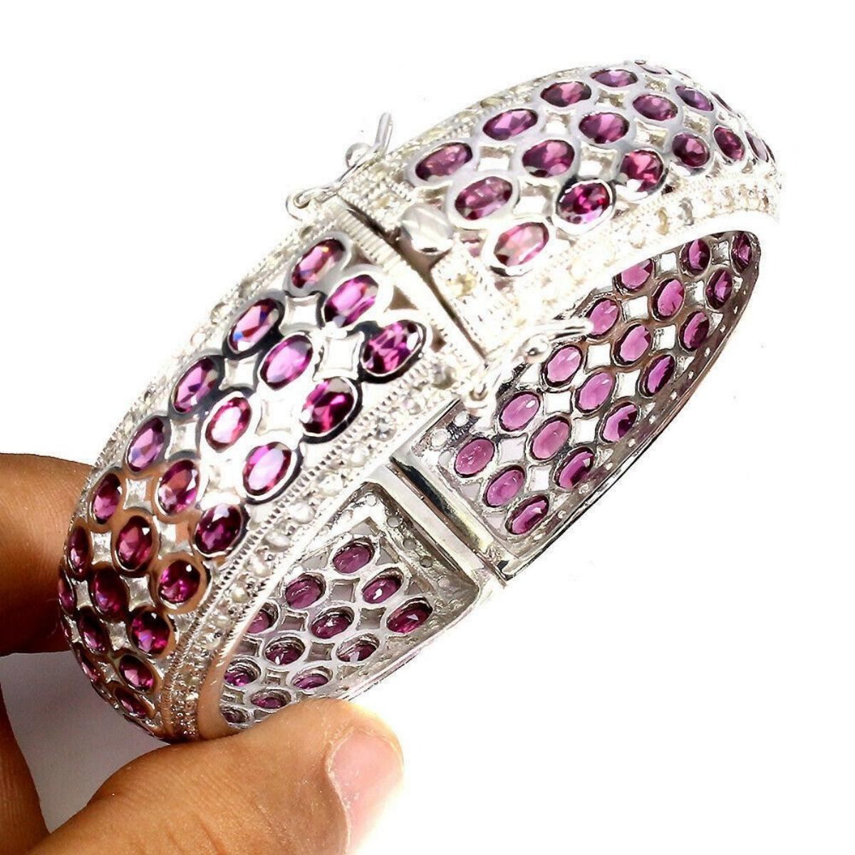 925 STERLING SILVER;PLATE-14K WHITE GOLD;MAIN STONE-RHODOLITE GARNET;OTHER GEMS-WHITE TOPAZ;TOTAL WEIGHT-51.89 GRAM or 255 carats (TOTAL WEIGHT OF SILVER + STONE)DIMENSION-* STONE 2.0 TO 5.0 X 3.0 MM. * DIAMETER 2.1 X 2.1 INCHES. * FACE BANGLE 71.0 X 17.0 MM.;MAIN STONE SHAPE-OVAL CUT;MAIN STONE COLOR-TOP RICH PINK RASPBERRY;CLARITY/GRADE-IF TO VVS;TREATMENT-UNHEATED;ORIGIN-AFRICA;HARDNESS-7.0 - 7.5;