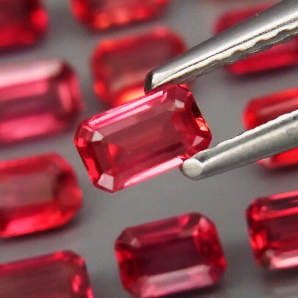 Natural Sapphire ; SHAPE Emerald Cut WEIGHT 3.81 Ct.SIZE 3.5x2 X to X 4.5x2.5 mm QUANTITY 20 Pieces COLOR Imperial Red CLARITY CLEAN & VS; LUSTER Superior ORIGIN - Africa; TREATMENT ; HARDNESS 9