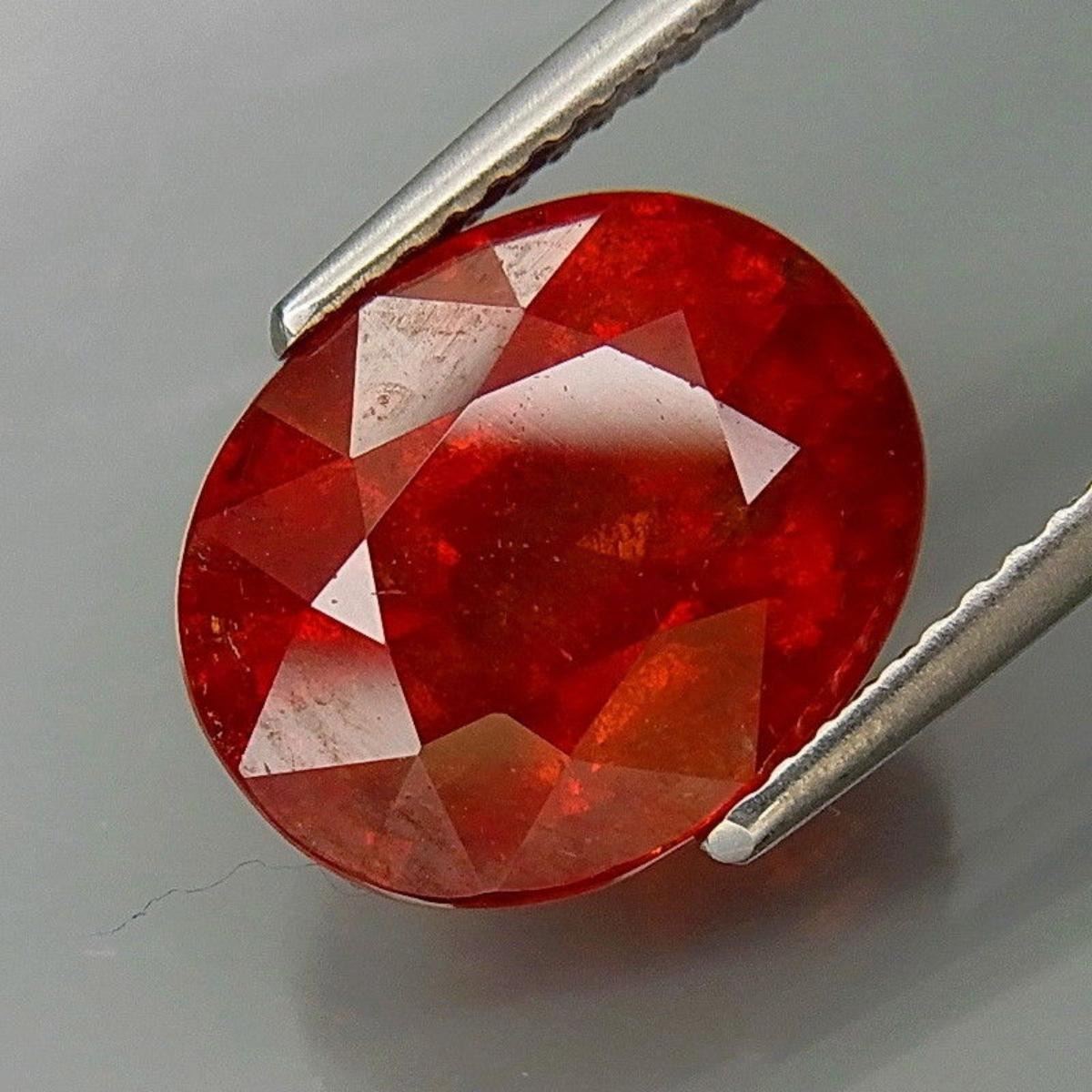 Spessartite Garnet SHAPE Oval WEIGHT 8.56 Ct.SIZE 12 X 10 X 8 mm; QUANTITY 1 Piece COLOR Best Orange Red; CLARITY TRANSPARENT LUSTER Superior ORIGIN Africa TREATMENT None HARDNESS 7-7.5