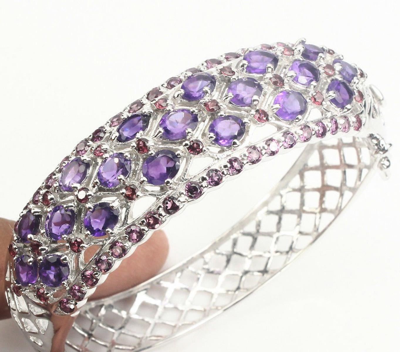 925 STERLING SILVER; PLATE -14K WHITE GOLD- MAIN STONE -AMETHYST;; OTHER GEMS -RHODOLITE GARNET; TOTAL WEIGHT 144.57 CT (TOTAL WEIGHT OF SILVER + STONE) DIMENSION * STONE 1.5 TO 5.0 X 4.0 MM. * DIAMETER 2.0 INCHES. * FACE BANGLE 64.0 X 16.0 MM. MAIN STONE SHAPE OVAL CUT MAIN STONE COLOR TOP INTENSE PURPLE CLARITY/GRADE IF TO VVS LUSTER CHARMING TREATMENT UNHEATED ORIGIN URUGURY HARDNESS 7.0