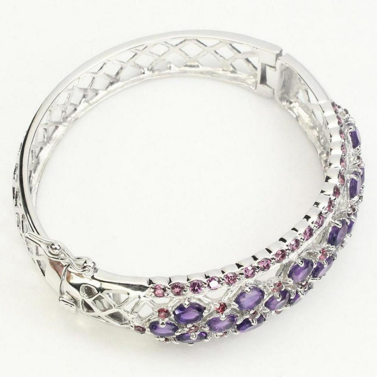 925 STERLING SILVER; PLATE -14K WHITE GOLD- MAIN STONE -AMETHYST;; OTHER GEMS -RHODOLITE GARNET; TOTAL WEIGHT 144.57 CT (TOTAL WEIGHT OF SILVER + STONE) DIMENSION * STONE 1.5 TO 5.0 X 4.0 MM. * DIAMETER 2.0 INCHES. * FACE BANGLE 64.0 X 16.0 MM. MAIN STONE SHAPE OVAL CUT MAIN STONE COLOR TOP INTENSE PURPLE CLARITY/GRADE IF TO VVS LUSTER CHARMING TREATMENT UNHEATED ORIGIN URUGURY HARDNESS 7.0