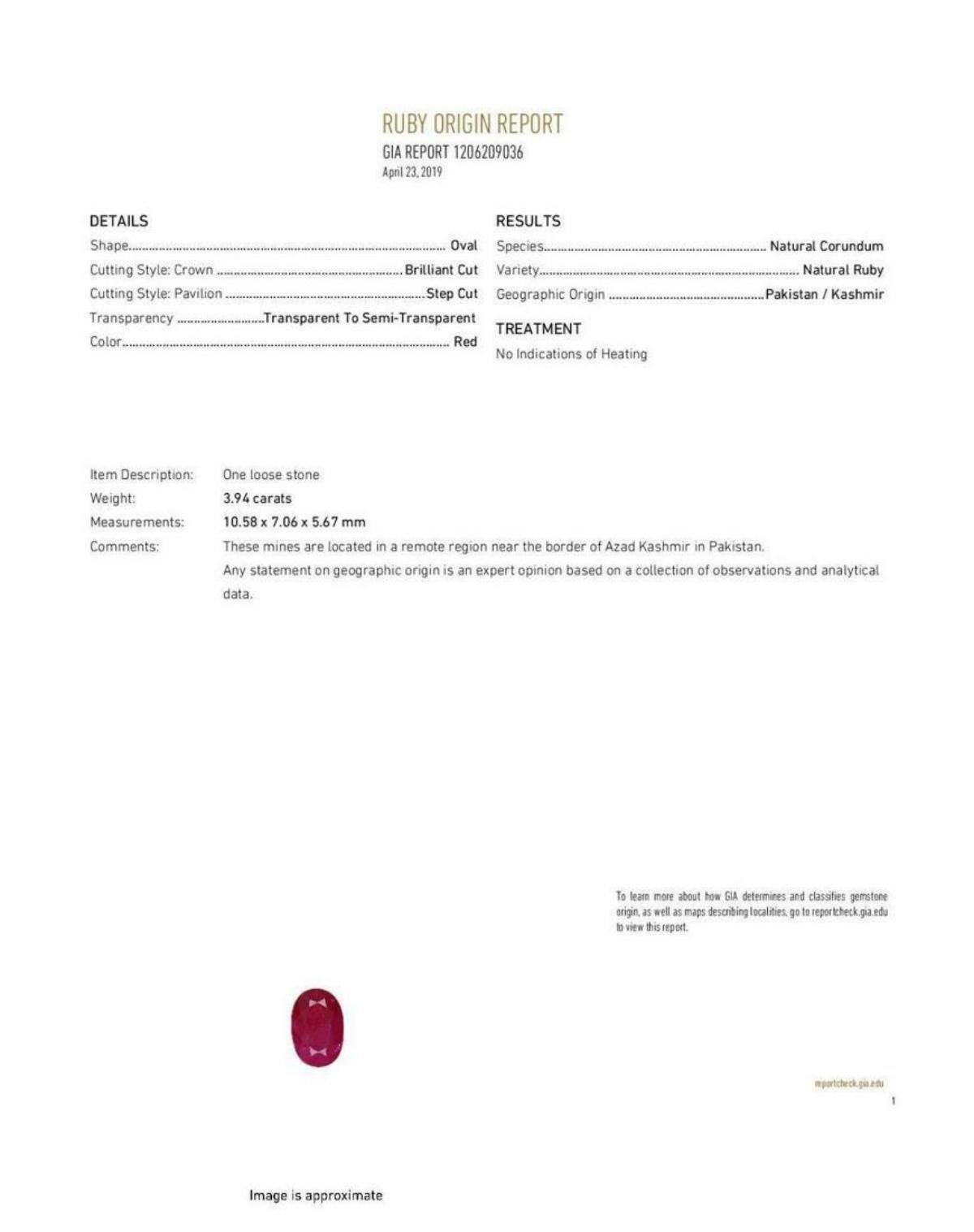 Natural Kashmir Origin Ruby 3.94 Cts - Untreated .....certified by GIA.....size 10.5 x 7 x 5.75 MM....Top Red color...Rare to find Batakundi Mines (Azad Kashmir) red ruby.....100% completely Natural....stone for the collectors or investment stone.