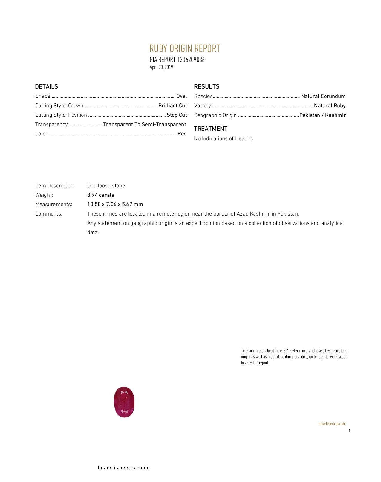 Natural Kashmir Origin Ruby 3.94 Cts - Untreated .....certified by GIA.....size 10.5 x 7 x 5.75 MM....Top Red color...Rare to find Batakundi Mines (Azad Kashmir) red ruby.....100% completely Natural....stone for the collectors or investment stone.