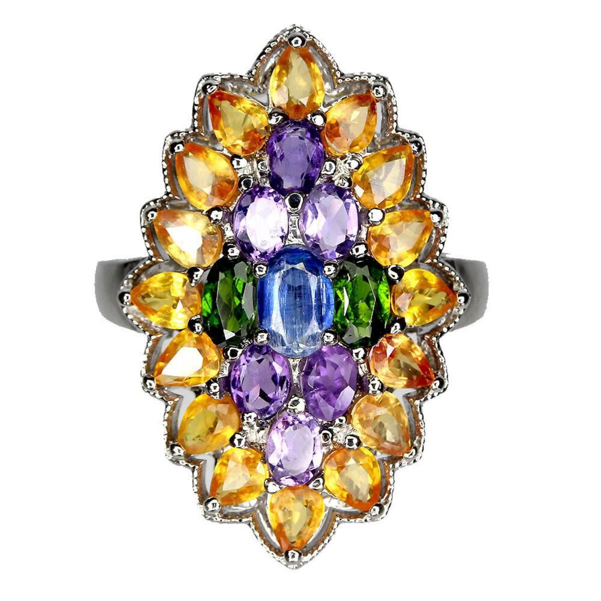 925 STERLING SILVER;PLATE-14K WHITE GOLD;RING SIZE-9(RESIZABLE);MAIN STONE-KYANITE;OTHER GEMS-AMETHYST, CHROME DIOPSIDE, CITRINE;TOTAL WEIGHT-5.62 GRAM (TOTAL WEIGHT OF SILVER + STONE);DIMENSION-* STONE 4.0 X 3.0 TO 6.0 X 4.0 MM. * RING SIZE 9.0 * FACE RING 29.0 X 19.0 MM.;MAIN STONE SHAPE-OVAL;MAIN STONE COLOR-CORNFLOWER BLUE;CLARITY/GRADE-IF TO VVS;TREATMENT-UNHEATED;ORIGIN-NEPAL;HARDNESS-5.0 - 7.0;
