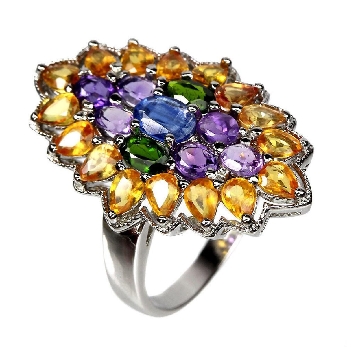 925 STERLING SILVER;PLATE-14K WHITE GOLD;RING SIZE-9(RESIZABLE);MAIN STONE-KYANITE;OTHER GEMS-AMETHYST, CHROME DIOPSIDE, CITRINE;TOTAL WEIGHT-5.62 GRAM (TOTAL WEIGHT OF SILVER + STONE);DIMENSION-* STONE 4.0 X 3.0 TO 6.0 X 4.0 MM. * RING SIZE 9.0 * FACE RING 29.0 X 19.0 MM.;MAIN STONE SHAPE-OVAL;MAIN STONE COLOR-CORNFLOWER BLUE;CLARITY/GRADE-IF TO VVS;TREATMENT-UNHEATED;ORIGIN-NEPAL;HARDNESS-5.0 - 7.0;