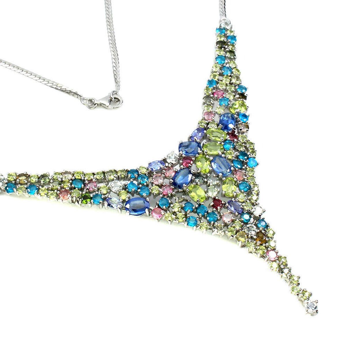 925 STERLING SILVER;PLATE-14K WHITE GOLD;LENGTH (INCHES)18;MAIN STONE-KYANITE;OTHER GEMS-APATITE, PERIDOT, TOURMALINE;TOTAL WEIGHT-30.67 GRAM (TOTAL WEIGHT OF SILVER + STONE)DIMENSION-* STONE 2.5 TO 7.0 X 5.0 MM.;* TOTAL LENGTH- 18.0 INCHES.;* STONES PART LENGTH -95.0 X 63.0 MM.;MAIN STONE SHAPE-OVAL CUT;MAIN STONE COLOR- RICH BLUECLARITY/GRADE-IF TO VVS;LUSTER-PRECIOUS;TREATMENT-UNHEATED;