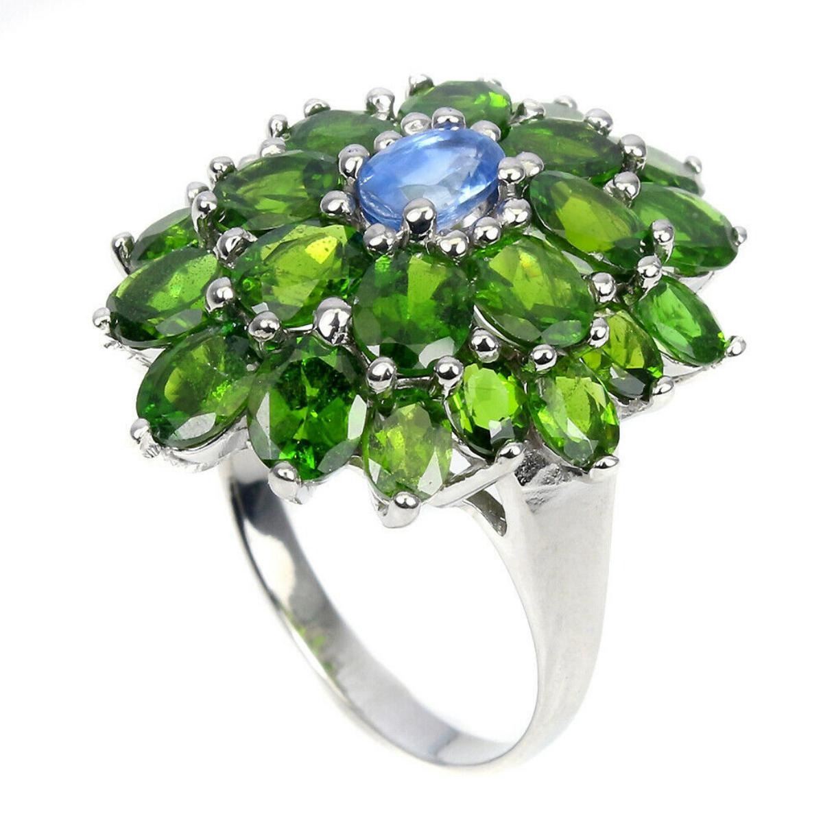 925 STERLING SILVER;PLATE-14K WHITE GOLD;RING SIZE-8(resizeable);MAIN STONE-KYANITE;OTHER GEMS-CHROME DIOPSIDE;TOTAL WEIGHT-7.9 GRAM (TOTAL WEIGHT OF SILVER + STONE)DIMENSION-* STONE 4.0 X 3.0 TO 6.0 X 4.0 MM. * RING SIZE 8.0 * FACE RING- 27.0 X 21.0 MM.;MAIN STONE SHAPE-OVAL CUT;MAIN STONE COLOR-TOP CORNFLOWER BLUE;CLARITY/GRADE-TRANSPARENT;TREATMENT-UNHEATED;ORIGIN-NEPAL;