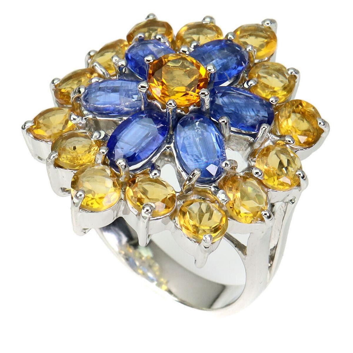 925 STERLING SILVER;PLATE-14K WHITE GOLD;RING SIZE-8(RESIZABLE);MAIN STONE-KYANITE;OTHER GEMS-CITRINE;TOTAL WEIGHT-9.41 GRAM (TOTAL WEIGHT OF SILVER + STONE);DIMENSION- * STONE 4.0 TO 6.0 X 4.0 MM.* RING SIZE 8.0* FACE RING 27.0 X 24.0 MM.;MAIN STONE SHAPE-OVAL CUT;MAIN STONE COLOR- BLUE;CLARITY/GRADE-IF TO VVS;TREATMENT-UNHEATED;ORIGIN-NEPAL;HARDNESS-5.0 - 7.0;
