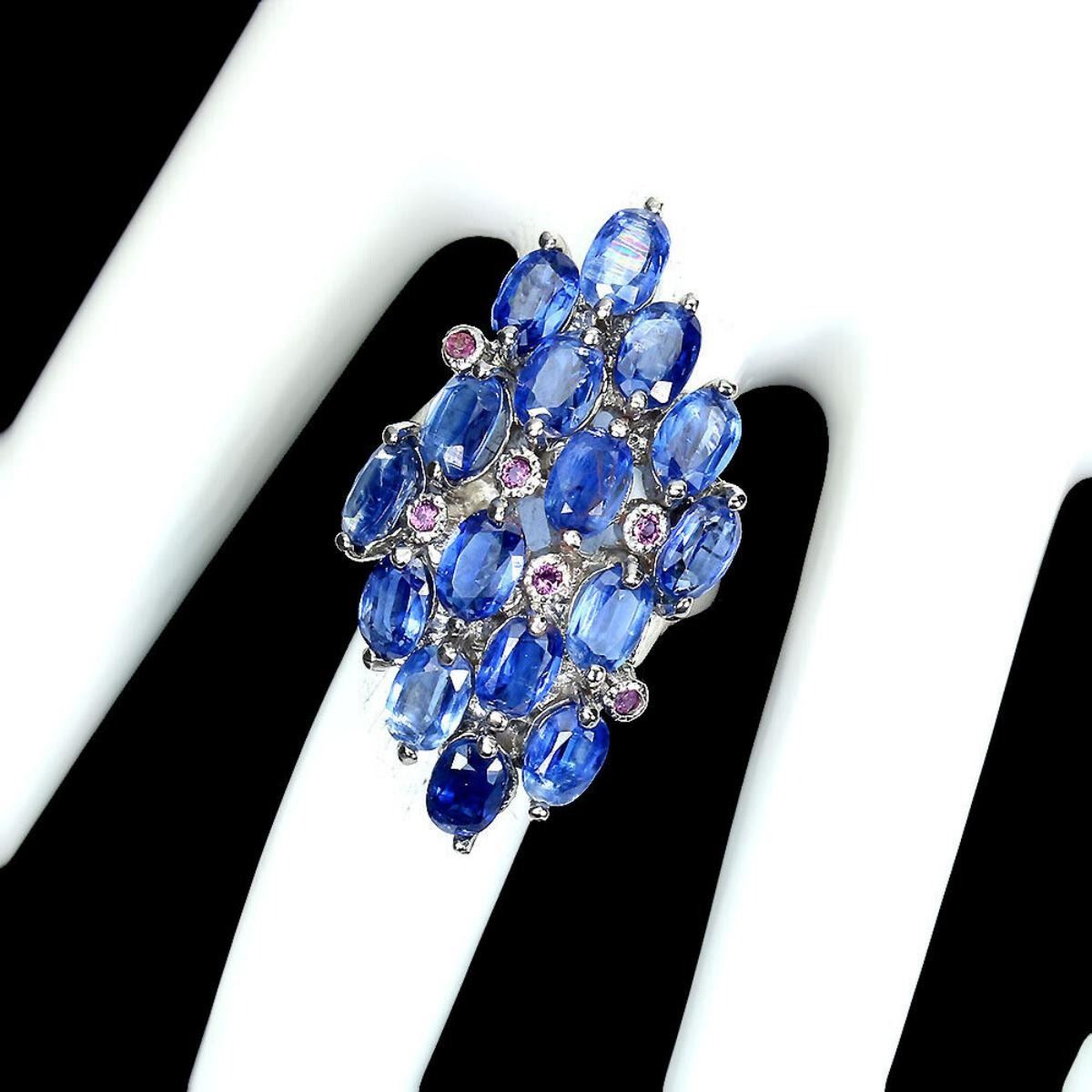 925 STERLING SILVER;PLATE-14K WHITE GOLD;RING SIZE-8(RESIZABLE);MAIN STONE-KYANITE;OTHER GEMS-RHODOLITE GARNET;TOTAL WEIGHT-10.81 GRAM (TOTAL WEIGHT OF SILVER + STONE);DIMENSION-* STONE 1.5 TO 6.0 X 4.0 MM. * RING SIZE 8.0 * FACE RING 37.0 X 21.0 MM.;MAIN STONE SHAPE-OVAL ;MAIN STONE COLOR-CORNFLOWER BLUE;CLARITY/GRADE-IF TO VVS;TREATMENT-UNHEATED;ORIGIN-NEPAL;HARDNESS-5.0 - 7.0;
