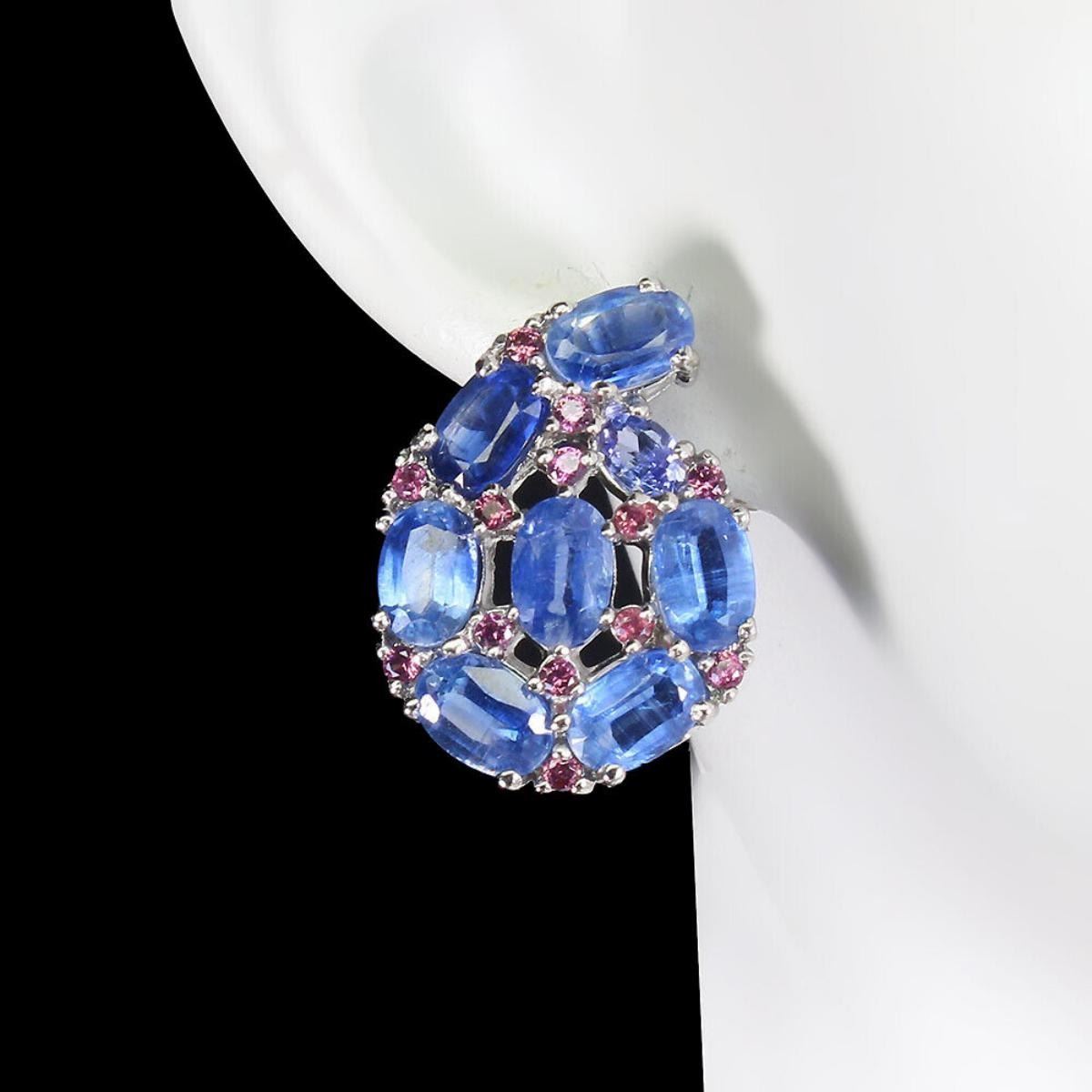 925 STERLING SILVER;PLATE-14K WHITE GOLD;MAIN STONE-KYANITE;OTHER GEMS-RHODOLITE GARNET, TANZANITE;TOTAL WEIGHT-5.77 GRAM (TOTAL WEIGHT OF SILVER + STONE);DIMENSION-* STONE 1.5 TO 6.0 X 4.0 MM.* FACE EARRINGS 22.0 X 15.0 MM.;MAIN STONE SHAPE-OVAL ;MAIN STONE COLOR-BLUE;CLARITY/GRADE-IF TO VVS;TREATMENT-UNHEATED;ORIGIN-NEPAL;