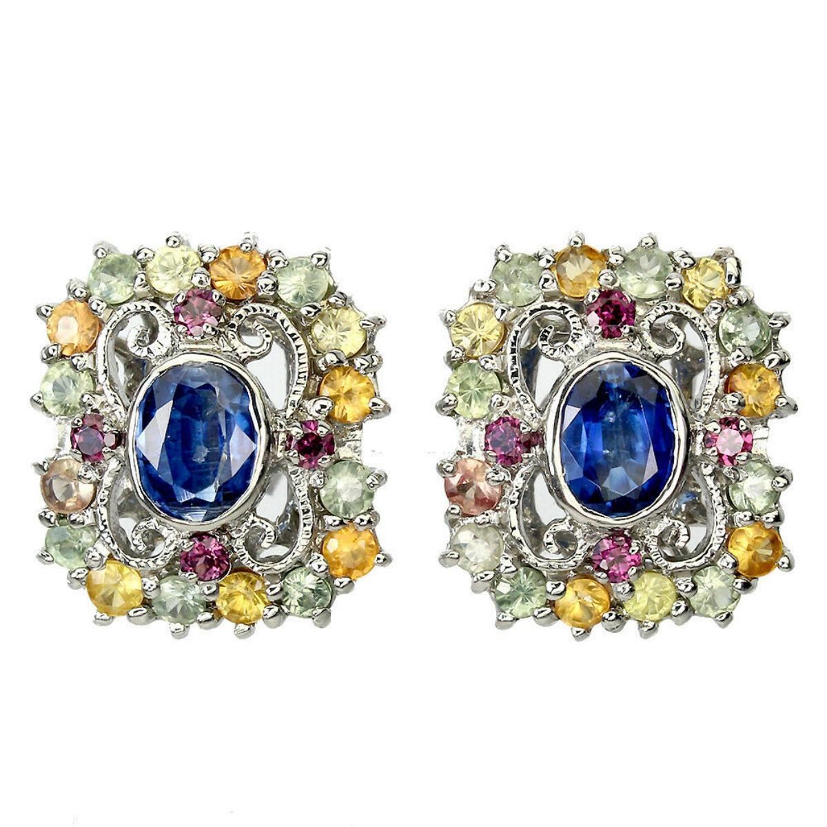 925 STERLING SILVER;PLATE-14K WHITE GOLD;MAIN STONE-KYANITE;OTHER GEMS-RHODOLITE GARNET, SAPPHIRE;TOTAL WEIGHT-7.3 GRAM (TOTAL WEIGHT OF SILVER + STONE)DIMENSION-* STONE 2.0 TO 7.0 X 5.0 MM. * FACE EARRINGS 17.0 X 15.0 MM.;MAIN STONE SHAPE-OVAL CUT;MAIN STONE COLOR- BLUE;CLARITY/GRADE-IF TO VVS;TREATMENT-UNHEATED;ORIGIN-NEPAL;HARDNESS-5.0 - 7.0;
