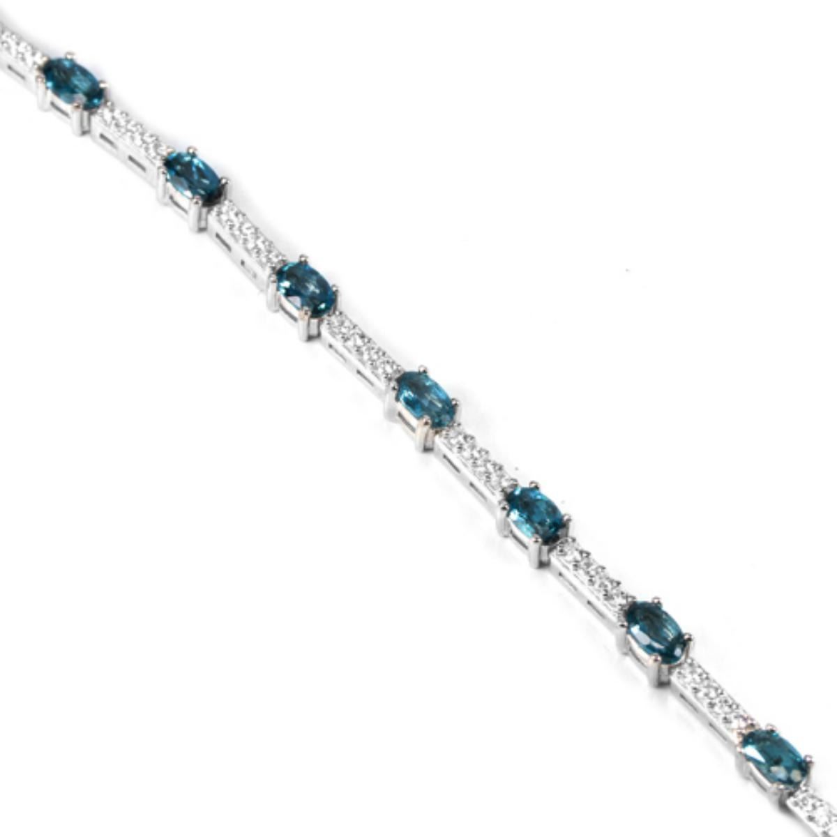 GENUINE AAA LONDON BLUE TOPAZ & CZ 925 SILVER BRACELET 14K WHITE GOLD COATING; LENGTH OF ITEM (Inch.)7.75 ;ITEM QUANTITY1STONE SHAPEOVALSTONE DIMENSION5 X 3 MM.ITEM WEIGHT8.9 GRAMCOLORLONDON BLUECLARITYIF - VVSLUSTERDAZZLINGTREATMENTIRRADIATIONORIGIN OF STONEAFRICAHARDNESS8.0WHITE CUBIC ZIRCONIA 1.5 MM.
