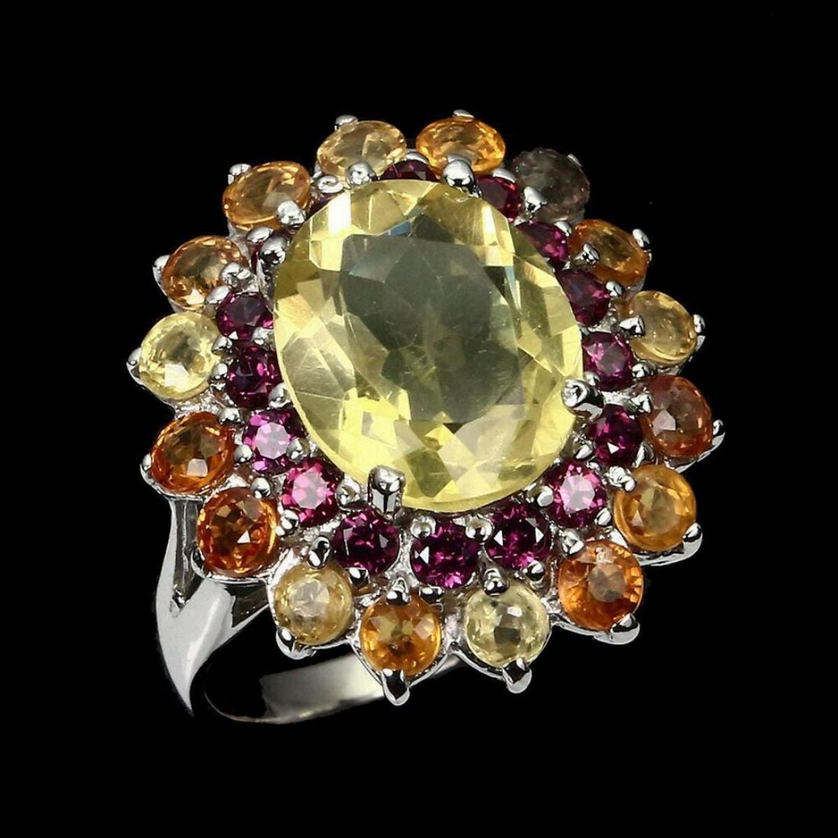 925 STERLING SILVER;PLATE-14K WHITE GOLD;RING SIZE(Resizeable)8.5;MAIN STONE-LEMON QUARTZ;OTHER GEMS-RHODOLITE GARNET, SAPPHIRE;TOTAL WEIGHT-6.22 GRAM (TOTAL WEIGHT OF SILVER + STONE)DIMENSION-* STONE 2.0 TO 12.0 X 10.0 MM. * RING SIZE 8.5 * FACE RING- 23.0 X 21.0 MM.;MAIN STONE SHAPE-OVAL CUT;MAIN STONE COLOR-TOP LEMON YELLOW;CLARITY/GRADE-IF TO VVS;TREATMENT-UNHEATED;ORIGIN-BRAZIL;HARDNESS-7;