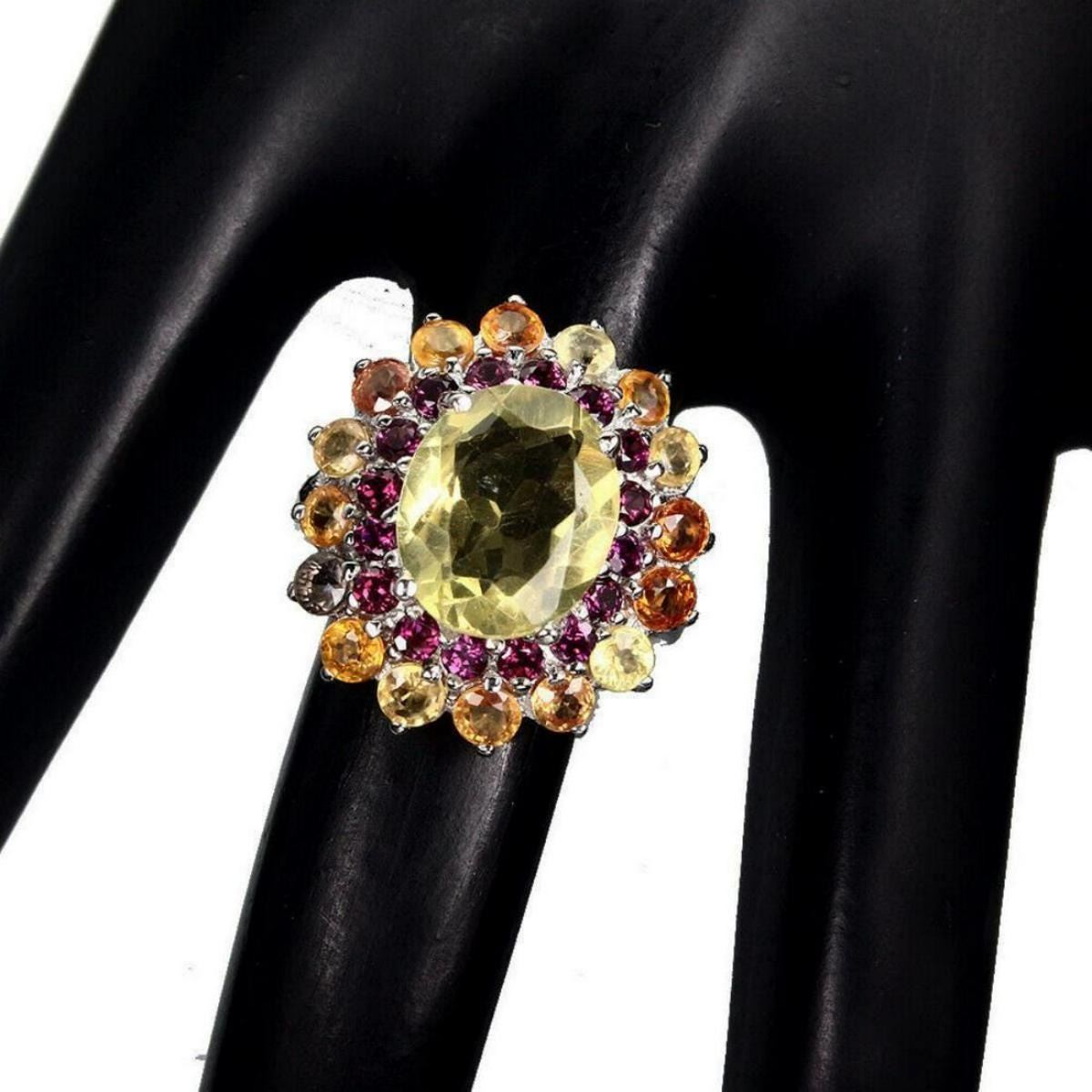 925 STERLING SILVER;PLATE-14K WHITE GOLD;RING SIZE(Resizeable)8.5;MAIN STONE-LEMON QUARTZ;OTHER GEMS-RHODOLITE GARNET, SAPPHIRE;TOTAL WEIGHT-6.22 GRAM (TOTAL WEIGHT OF SILVER + STONE)DIMENSION-* STONE 2.0 TO 12.0 X 10.0 MM. * RING SIZE 8.5 * FACE RING- 23.0 X 21.0 MM.;MAIN STONE SHAPE-OVAL CUT;MAIN STONE COLOR-TOP LEMON YELLOW;CLARITY/GRADE-IF TO VVS;TREATMENT-UNHEATED;ORIGIN-BRAZIL;HARDNESS-7;