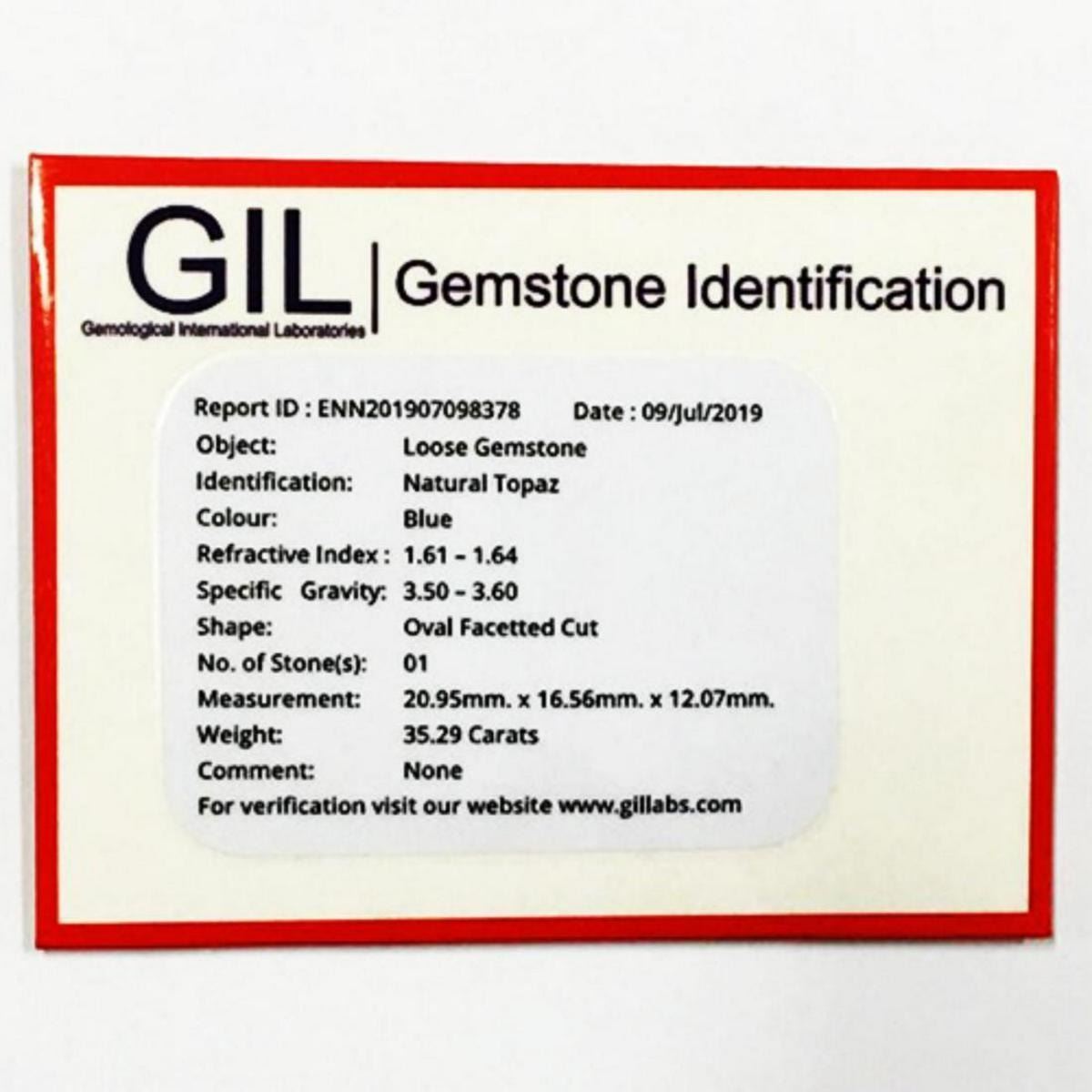 Natural Topaz (Certified) WEIGHT : 35.29 cts; SHAPE : Oval; SIZE ( L x W x D ) : 20.95 x 16.56 x 12.07 mm; QUANTITY : 1 piece; COLOR : Blue (Natural Color) CLARITY : Flawless-VVS1 AAA Grade; ORIGIN : Brazil; HARDNESS : 8; LUSTER : Excellent!!! TREATMENT : Unheated & Untreated 100% Natural;