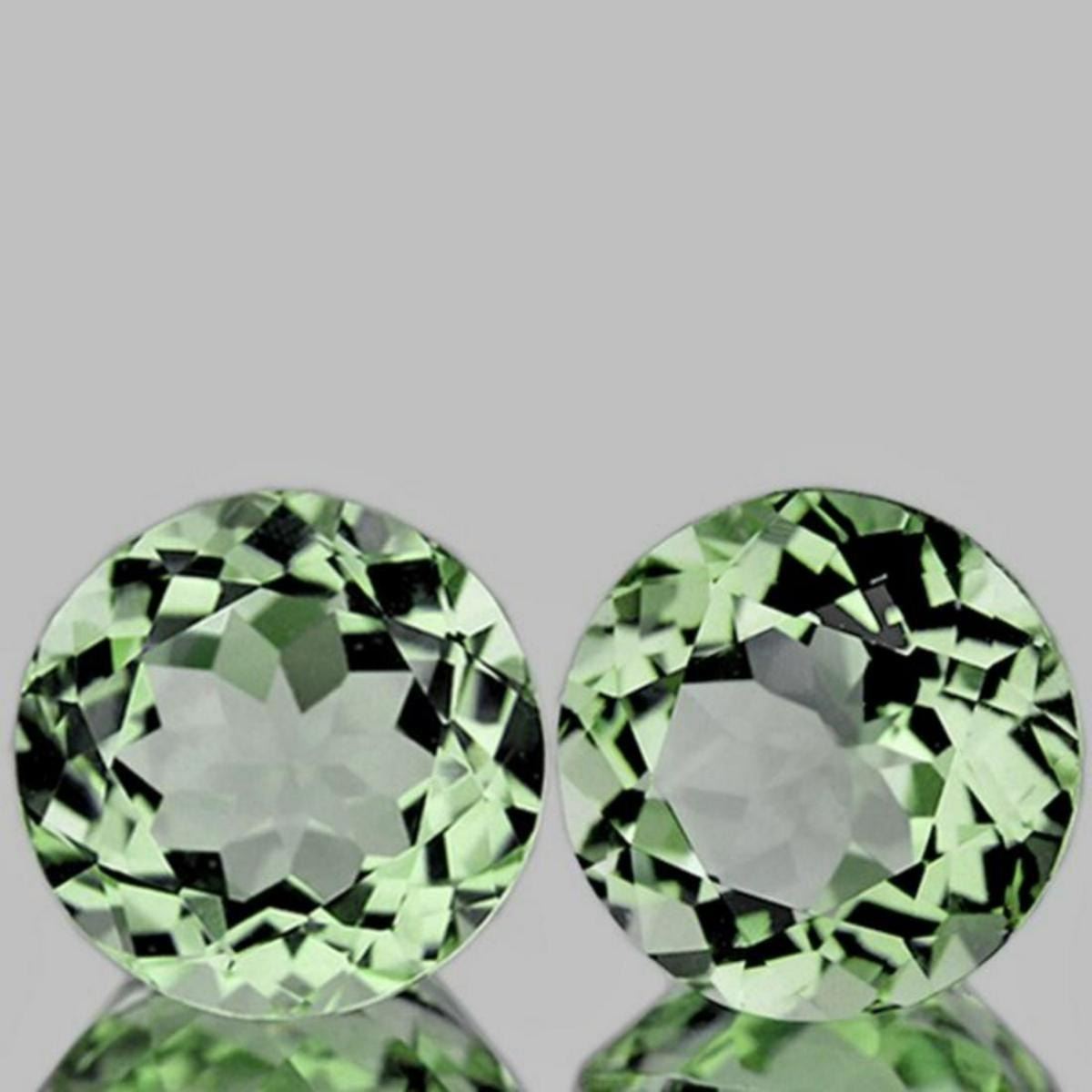 Natural Green Amethyst (Prasiolite)SIZE ( L x W x D ) : 12.00 mm;COLOR : Green;SHAPE : Round;QUANTITY : 2 piecesLUSTER : Excellent; CLARITY : FLAWLESS-VVS BEST QUALITYHARDNESS : 7ORIGIN : Brazil; TREATMENT : 100% Natural Unheated;