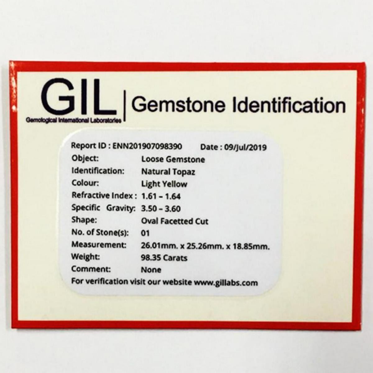 Natural Topaz ..... WEIGHT : 98.35 cts; SHAPE : Oval; SIZE ( L x W x D ) : 26.01 x 25.26 x 18.85 mm; QUANTITY : 1 piece; COLOR : Yellowish Blue (Natural Color) CLARITY : Flawless-VVS1 AAA Grade; ORIGIN : Brazil; HARDNESS : 8; LUSTER : Excellent!!! TREATMENT; : Unheated & Untreated 100% Natural; Certified