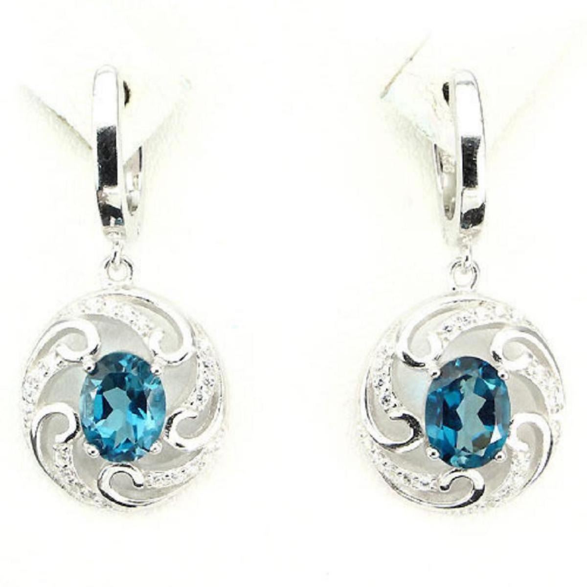 LONDON BLUE TOPAZ (NATURAL) & CUBIC ZIRCONIA 14K WHITE GOLD COATING 925 SILVER EARRINGS;UNIT OF ITEM (S):2 PIECES;WEIGHT (CT.):33.56 CT. (total weight of silver + stone)DIMENSION:* STONE 8.0 X 6.0 MM. * CZ 1.0 MM. * FACE EARRINGS 32.0 X 15.0 MM.;SHAPE/CUT:OVAL FACET & ROUND DIAMOND CUT;COLOR:TOP LONDON BLUE & AAA WHITE;CLARITY/GRADE:IF TO VVS;LUSTER:ELEGANT;TREATMENT:HEATED;ORIGIN:AFRICA;HARDNESS:8.0