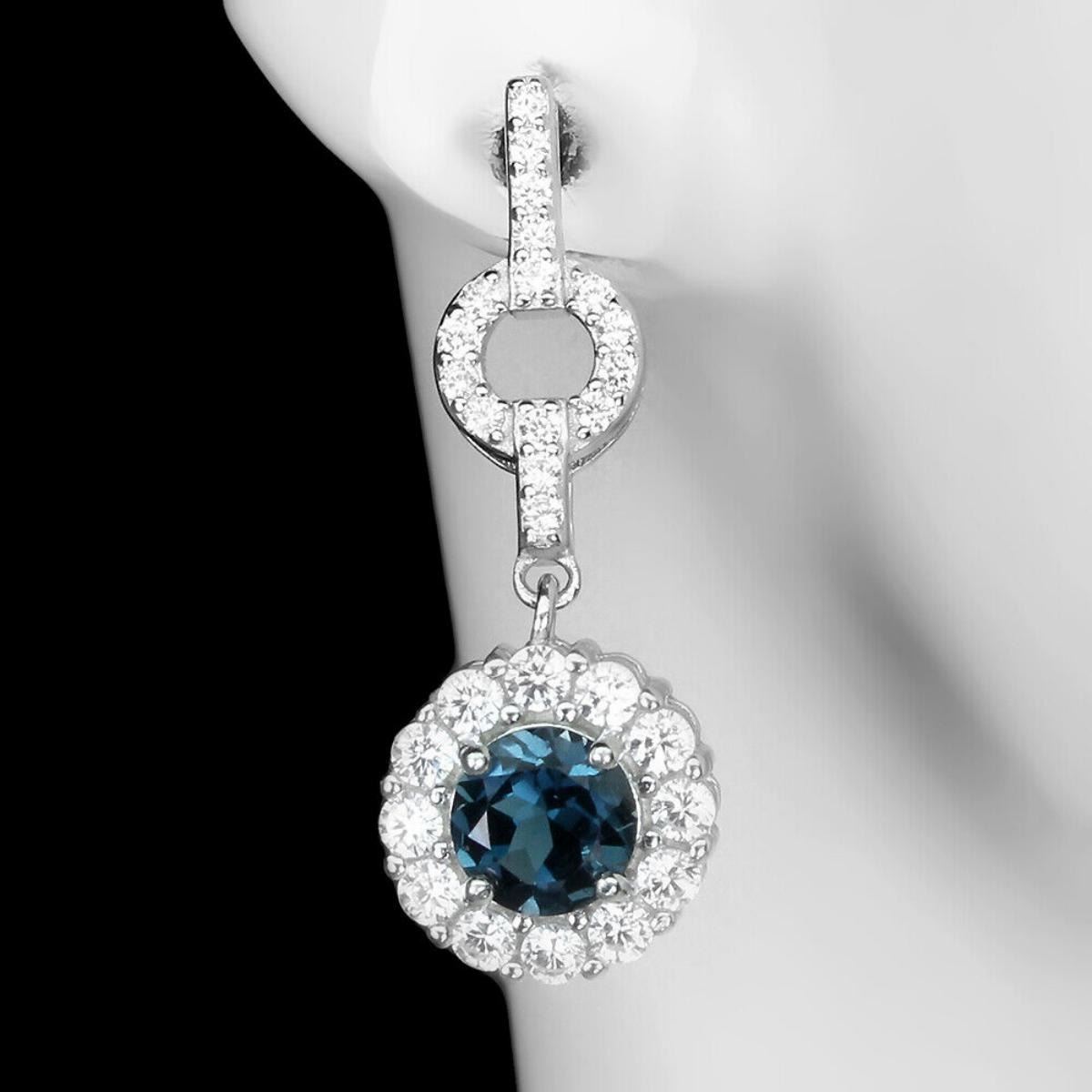 925 STERLING SILVER;PLATE-14K WHITE GOLD;MAIN STONE-LONDON BLUE TOPAZ;TOTAL WEIGHT-3.91 GRAM (TOTAL WEIGHT OF SILVER + STONE)DIMENSION-* STONE 5.5 MM.;;* FACE EARRINGS- 27.0 X 10.0 MM.;MAIN STONE SHAPE--ROUND CUT;MAIN STONE COLOR-TOP LONDON BLUE;CLARITY/GRADE-IF TO VVS;TREATMENT-IRRADIATED;ORIGIN-AFRICA;HARDNESS-8.0;