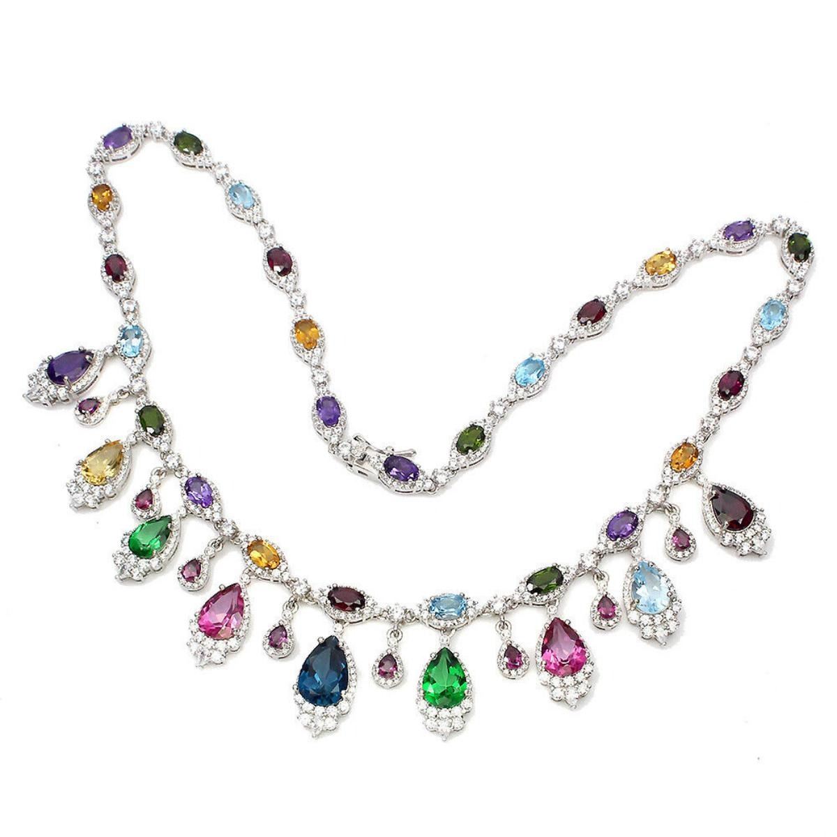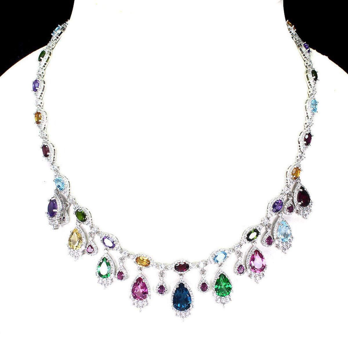 925 STERLING SILVER;PLATE-14K WHITE GOLD;LENGTH (INCHES)17.5;MAIN STONE-LONDON BLUE TOPAZ;OTHER GEMS-AMETHYST, CHROME DIOPSIDE, CITRINE, GREEN TOPAZ, PINK TOPAZ, RHODOLITE GARNET, SKY BLUE TOPAZ;;TOTAL WEIGHT-41.29 GRAM (TOTAL WEIGHT OF SILVER + STONE)DIMENSION-* STONE 4.0 X 3.0 TO 12.0 X 8.0 MM.;* TOTAL LENGTH- 17.5 INCHES.;* STONES PART LENGTH- 430.0 X 27.0 MM.;MAIN STONE SHAPE-PEAR CUT;MAIN STONE COLOR-LONDON BLUE;CLARITY/GRADE-IF;;TREATMENT-Standard;ORIGIN-Brazil;HARDNESS-8.0;
