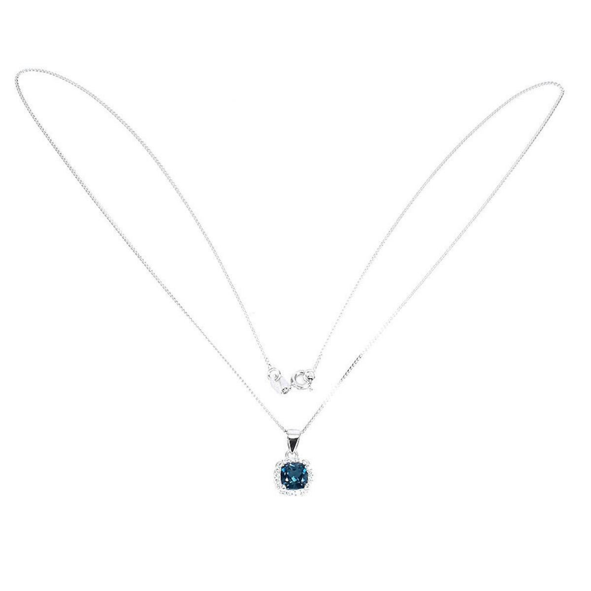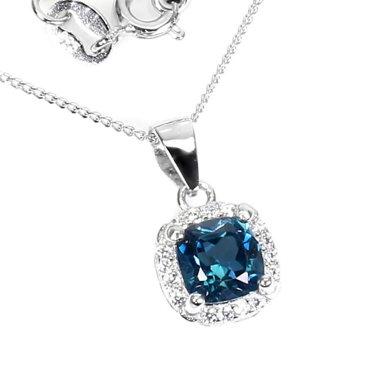925 STERLING SILVER;PLATE-14K WHITE GOLD;LENGTH (INCHES)-18;MAIN STONE-LONDON BLUE TOPAZ;TOTAL WEIGHT-2.65 GRAM (TOTAL WEIGHT OF SILVER + STONE);DIMENSION-* STONE 6.0 MM.* TOTAL LENGTH 18.0 INCHES.* STONES PART LENGTH 16.0 X 9.0 MM.;MAIN STONE SHAPE-CUSHION CUT;MAIN STONE COLOR- LONDON BLUE;CLARITY/GRADE-IF;TREATMENT-HEATED;ORIGIN-AFRICA;HARDNESS-8;