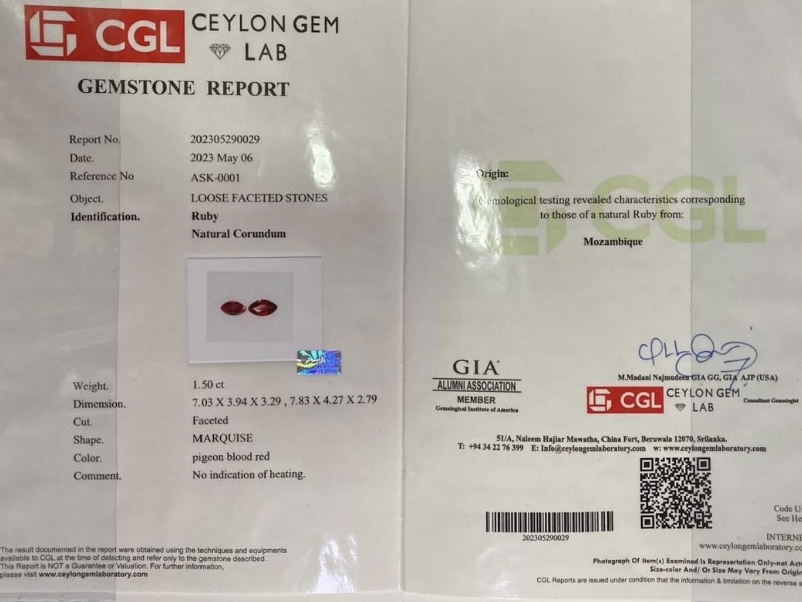 Pigeon Blood Red/ Vivid Red Untreated Marquise Cut Ruby Pair. Total Weight 1.50 Cts; Size 7.83 x 4.27 & 7.03 x 3.94 MM; Origin - Mozambique; completely untreated with Lab certifiacte; Clarity - Loupe Clean;