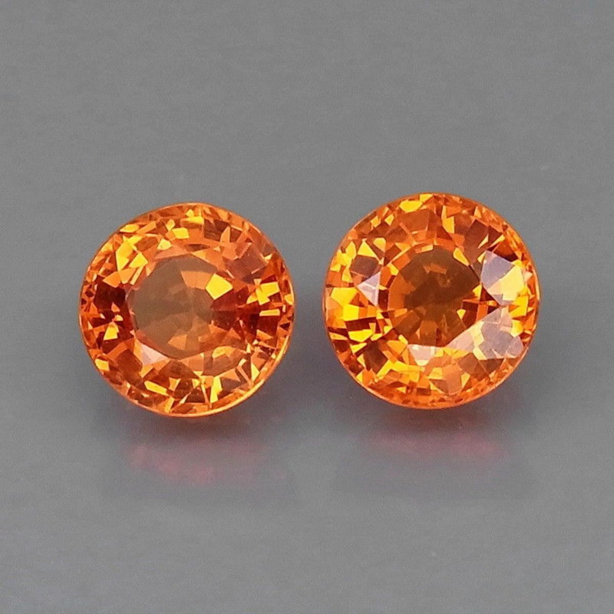 Natural Sapphire (Heated)SHAPE Round WEIGHT1.44 Ct.;SIZE 5 mm QUANTITY 2 Pieces; COLOR Orange CLARITY CLEAN LUSTER Superior; ORIGIN (Madagascar)Africa TREATMENT -Heated;HARDNESS 9