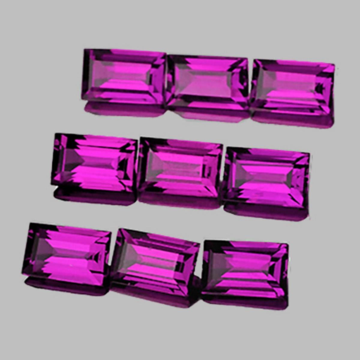 Natural Rhodolite Garnet; WEIGHT : 3.00 cts; SHAPE : Baguette; SIZE ( L x W x D ) : 5.00 x 3.00 mm; QUANTITY : 9 pieces ( Perfectly Matched Set) COLOR : Magenta Purple AAA Color; CLARITY : Flawless-VVS AAA Grade; ORIGIN : Umba Valley, Tanzania; HARDNESS : 7; LUSTER : AAA Fire!!! TREATMENT : 100% Natural Unheated;