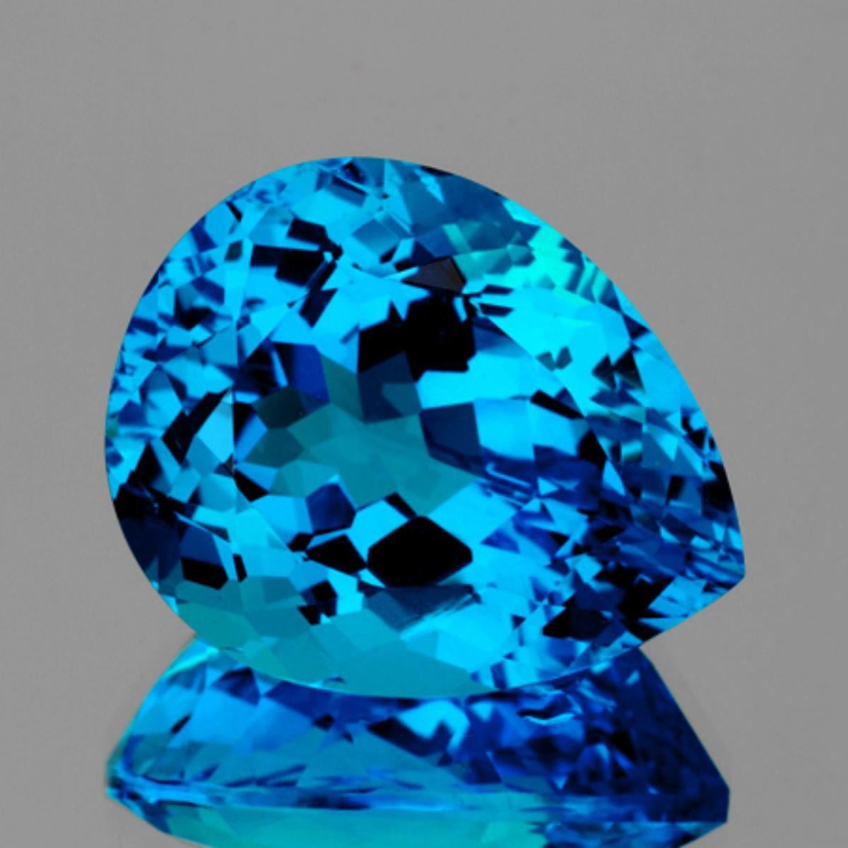 Natural Topaz WEIGHT : 27.28 cts SHAPE : Pear SIZE ( L x W x D ) : 20.32 x 16.56 x 11.11 mm QUANTITY : 1 pieces COLOR : Intense Swiss Blue CLARITY : Flawless-VVS1 ORIGIN : Brazil HARDNESS : 8 LUSTER : Excellent!!! TREATMENT : Heated