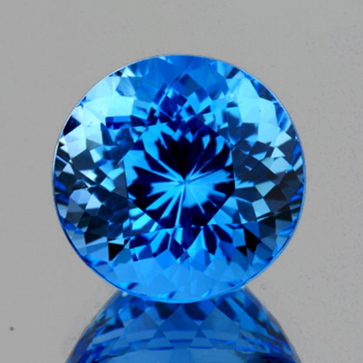 Natural Topaz WEIGHT : 34.42 cts SHAPE : Round SIZE ( L x W x D ) : 17.42 x 14.00 mm QUANTITY : 1 piece COLOR : Swiss Blue AAA COLOR CLARITY : Flawless-VVS1 ORIGIN : Brazil HARDNESS : 8 LUSTER : Excellent!!! TREATMENT : Heated