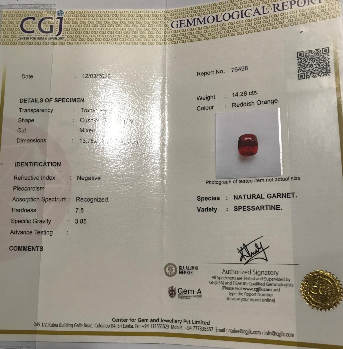 Natural Mandarin Orange Spessartite Garnet - Completely eye clean .....weight - 14.28 Carats ..Cushion Cut......Hardness 7.5; ..Origin - Nigeria; Certified