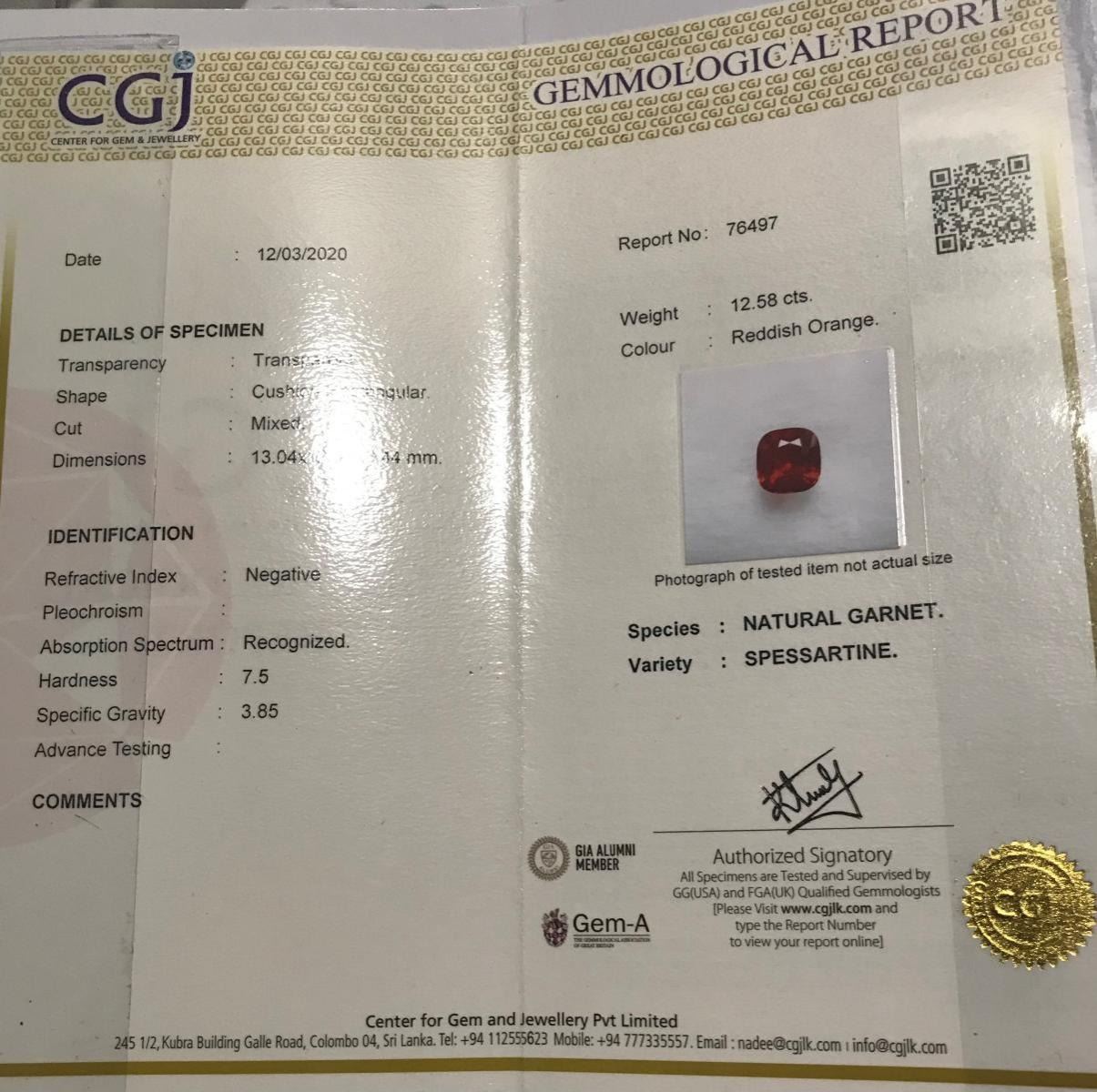 Natural Mandarin Orange Spessartite Garnet - Completely eye clean .....weight - 12.58 Carats ..Cushion Cut......Hardness 7.5; ..Origin - Nigeria; Certified