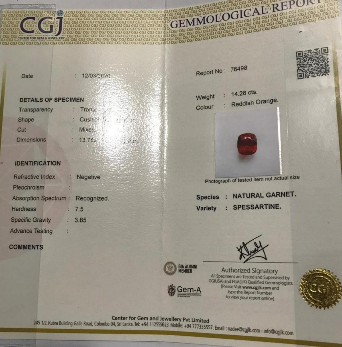 Natural Mandarin Orange Spessartite Garnet - Completely eye clean .....weight - 14.28 Carats ..Cushion Cut......Hardness 7.5; ..Origin - Nigeria; Certified