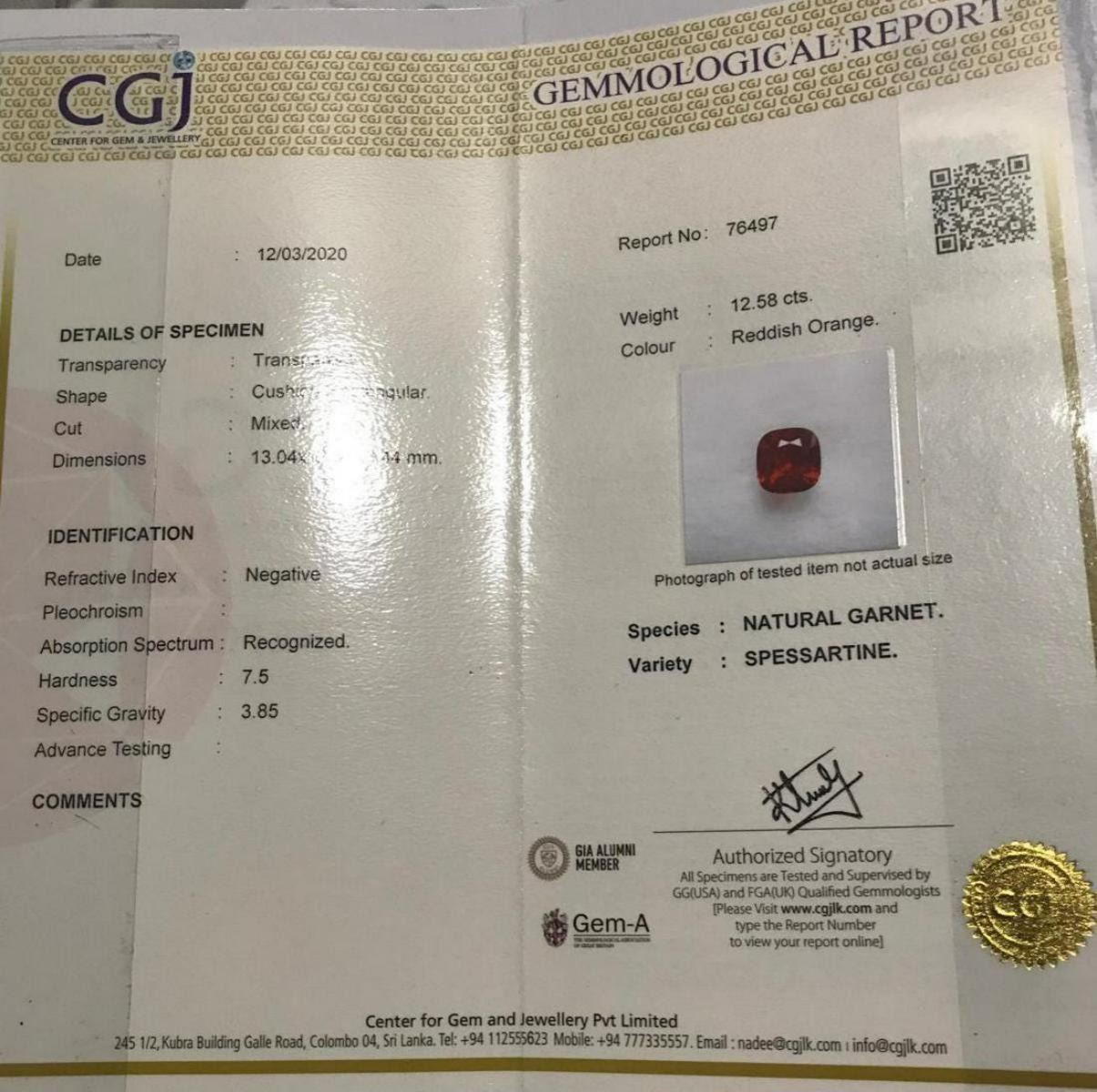 Natural Mandarin Orange Spessartite Garnet - Completely eye clean .....weight - 12.58 Carats ..Cushion Cut......Hardness 7.5; ..Origin - Nigeria; Certified
