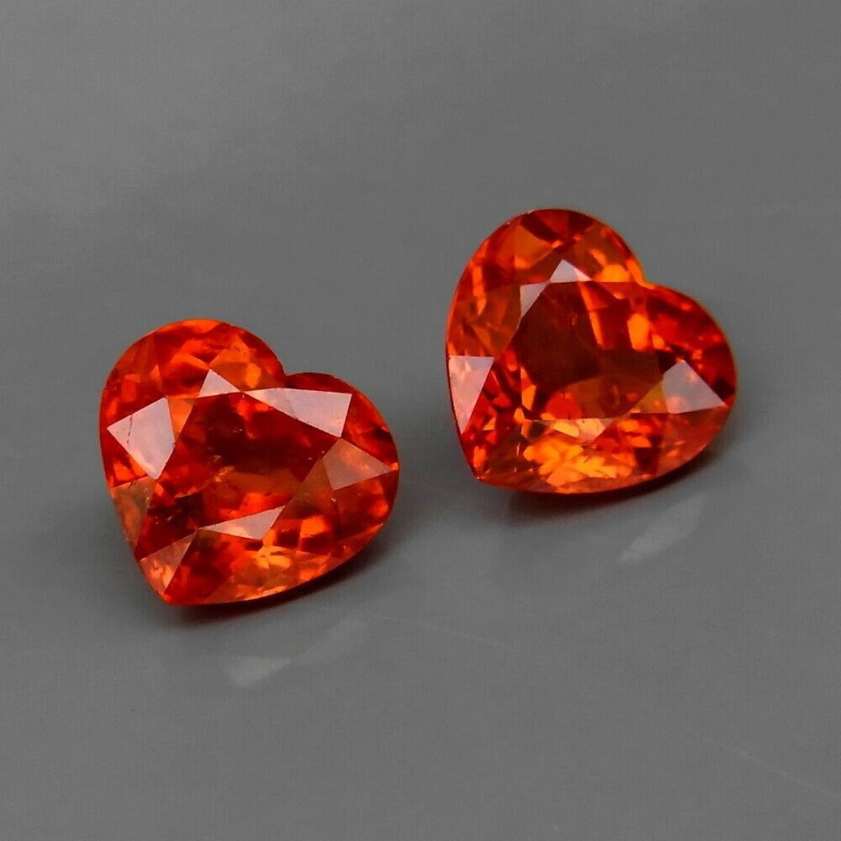 Spessartite Garnet SHAPE Heart Shape WEIGHT 2.62 Ct.SIZE 6.5 X 6 mm; QUANTITY 2 Pieces COLOR Fire Mandarin Orange LUSTER Superior ORIGIN Namibia TREATMENT None HARDNESS 7-7.5