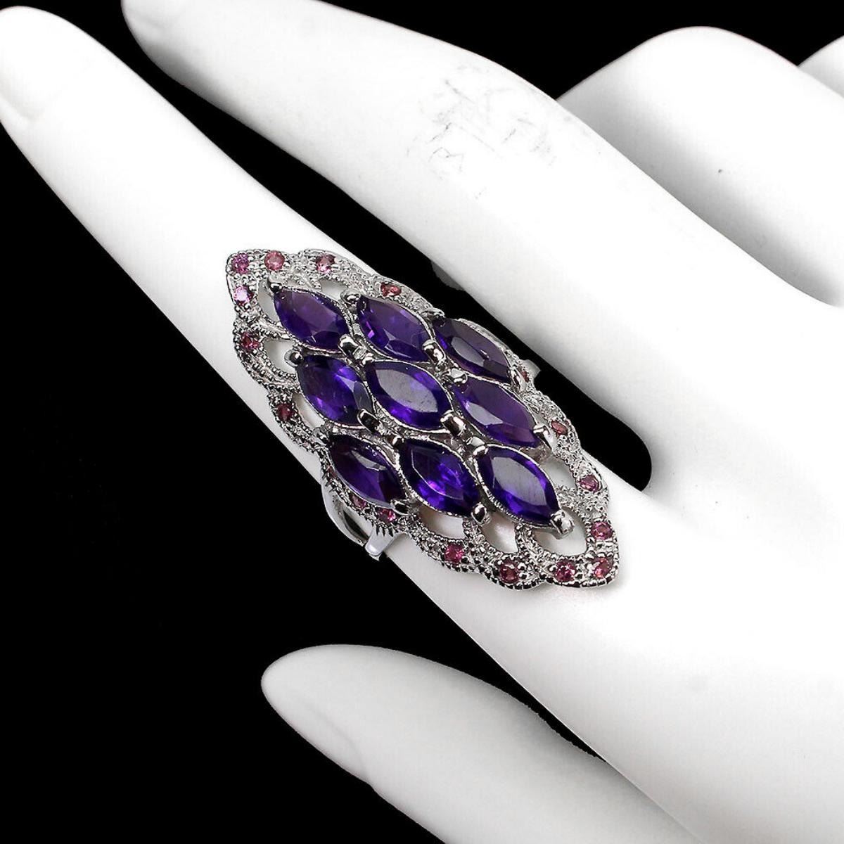925 STERLING SILVER;PLATE-14K WHITE GOLD;RING SIZE/resizeable-8.5;MAIN STONE-AMETHYST;OTHER GEMS-RHODOLITE GARNET;TOTAL WEIGHT-7.69 GRAM (TOTAL WEIGHT OF SILVER + STONE)DIMENSION-* STONE 1.5 TO 8.0 X 4.0 MM. * RING SIZE 8.5 * FACE RING -39.0 X 19.0 MM.MAIN STONE SHAPE-MARQUISE CUTMAIN STONE COLOR-- PURPLE;CLARITY/GRADE-IF TO VVS;TREATMENT-UNHEATED;ORIGIN-URUGUAY;HARDNESS-7;