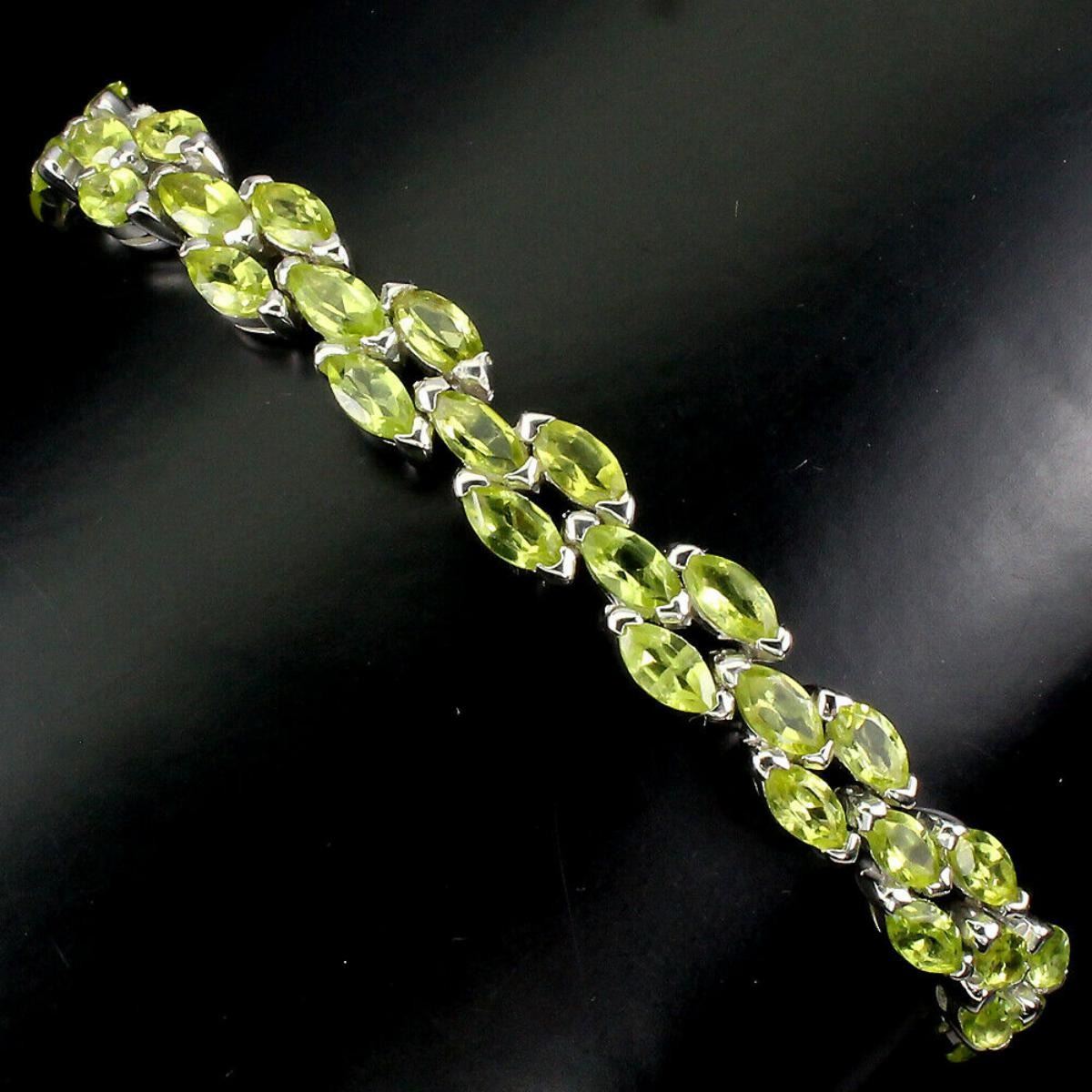 925 STERLING SILVER;PLATE-14K WHITE GOLD;LENGTH (INCHES)-7.5;MAIN STONE-PERIDOT;TOTAL WEIGHT-18.83 GRAM (TOTAL WEIGHT OF SILVER + STONE)DIMENSION* STONE 6.0 X 3.0 MM. * FACE BRACELET 180.0 X 8.0 MM.;MAIN STONE SHAPE-MARQUISE CUT;MAIN STONE COLOR-TOP RICH GREEN;CLARITY/GRADE-IF TO VVS;TREATMENT-UNHEATED;ORIGIN-PAKISTAN;HARDNESS-6.5 - 7.0
