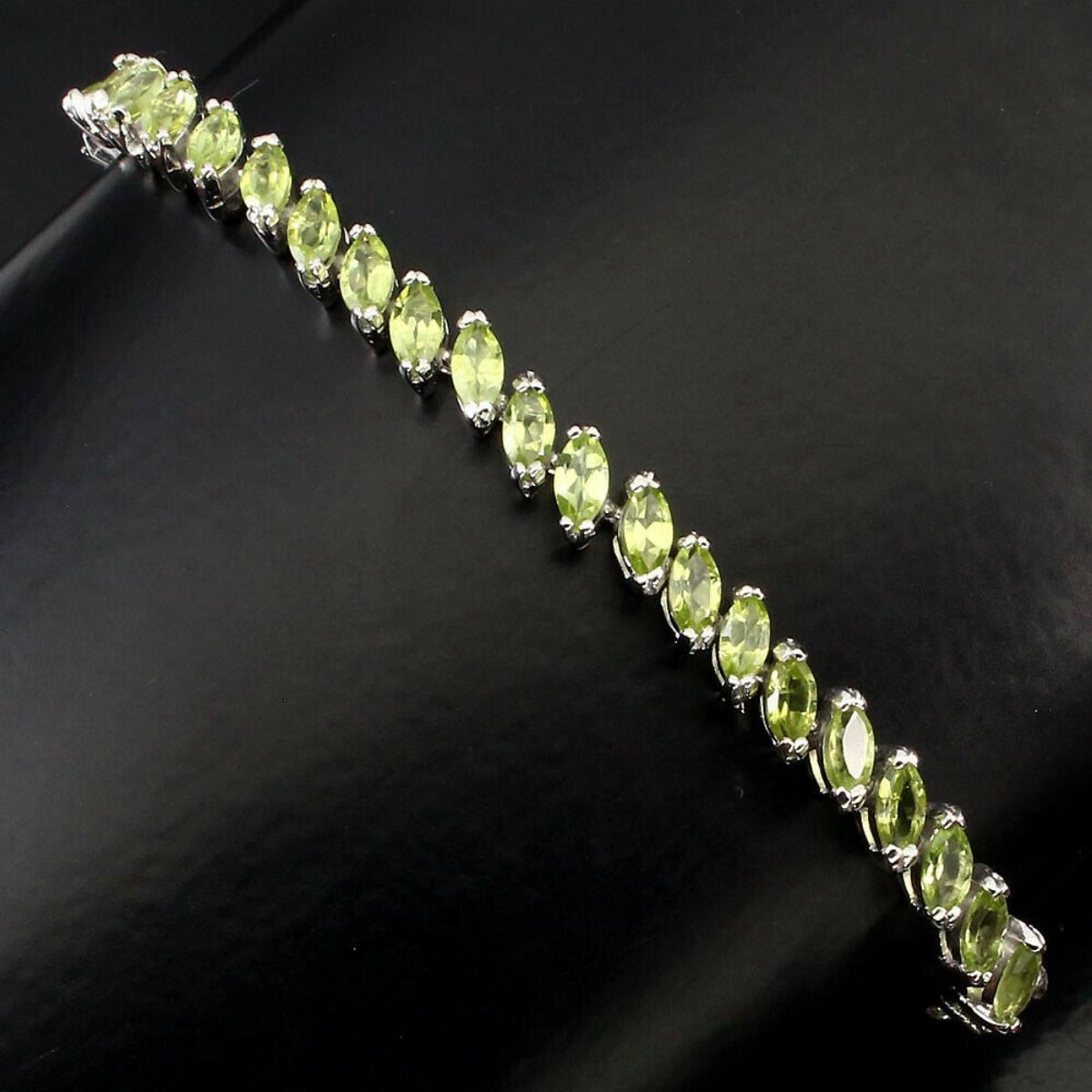 925 STERLING SILVER;PLATE...14K WHITE GOLD;LENGTH (INCHES)7;MAIN STONE-PERIDOT;TOTAL WEIGHT-72.95 CT (TOTAL WEIGHT OF SILVER + STONE)DIMENSION* STONE 6.0 X 3.0 MM. * FACE BRACELET 176.0 X 5.0 MM.;MAIN STONE SHAPE-MARQUISE CUT;MAIN STONE COLOR-TOP RICH GREEN;CLARITY/GRADE-IF TO VVS;TREATMENT-UNHEATED;ORIGIN-PAKISTAN;HARDNESS-6.5 - 7.0;