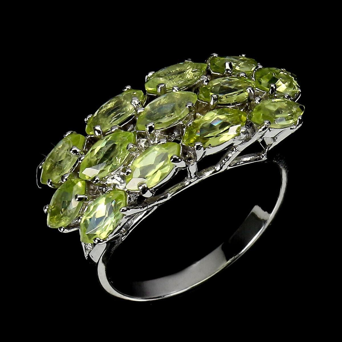 925 STERLING SILVER;PLATE-14K WHITE GOLD;RING SIZE-9(RESIZABLE);MAIN STONE-PERIDOT;TOTAL WEIGHT-5.35 GRAM (TOTAL WEIGHT OF SILVER + STONE);DIMENSION-* STONE 6.0 X 3.0 MM. * RING SIZE 9.0 * FACE RING 27.0 X 10.0 MM.;MAIN STONE SHAPE-MARQUISE;MAIN STONE COLOR-GREEN;CLARITY/GRADE-IF TO VVS;TREATMENT-UNHEATED;ORIGIN-PAKISTAN;HARDNESS-6.5 - 7.0;