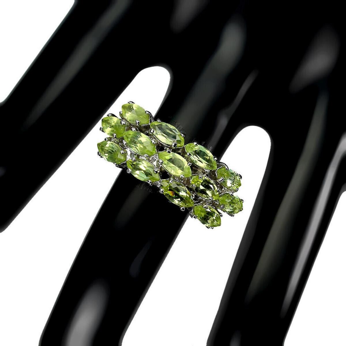 925 STERLING SILVER;PLATE-14K WHITE GOLD;RING SIZE-9(RESIZABLE);MAIN STONE-PERIDOT;TOTAL WEIGHT-5.35 GRAM (TOTAL WEIGHT OF SILVER + STONE);DIMENSION-* STONE 6.0 X 3.0 MM. * RING SIZE 9.0 * FACE RING 27.0 X 10.0 MM.;MAIN STONE SHAPE-MARQUISE;MAIN STONE COLOR-GREEN;CLARITY/GRADE-IF TO VVS;TREATMENT-UNHEATED;ORIGIN-PAKISTAN;HARDNESS-6.5 - 7.0;