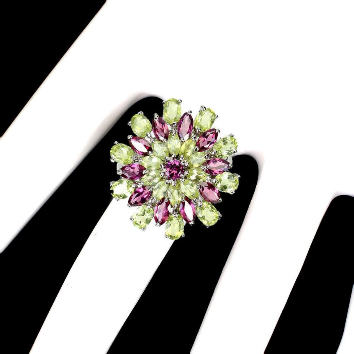 925 STERLING SILVER;PLATE-14K WHITE GOLD;RING SIZE-7.5(RESIZABLE);MAIN STONE-RHODOLITE GARNET;OTHER GEMS-PERIDOT;TOTAL WEIGHT-4.24 GRAM (TOTAL WEIGHT OF SILVER + STONE);DIMENSION-* STONE 3.0 TO 5.0 X 2.5 MM. * RING SIZE 7.5 * FACE RING 22.0 X 21.0 MM.;MAIN STONE SHAPE-MARQUISE CUT;MAIN STONE COLOR-PINK RASPBERRY;CLARITY/GRADE-IF TO VVS;TREATMENT-UNHEATED;ORIGIN-AFRICA;HARDNESS-7;