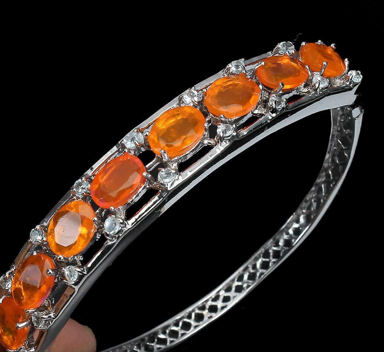 925 STERLING SILVER;;PLATE-14K WHITE GOLD;MAIN STONE-ORANGE OPAL;OTHER GEMS-AQUAMARINE;TOTAL WEIGHT-16.29 GRAM (TOTAL WEIGHT OF SILVER + STONE)DIMENSION-* STONE 2.0 TO 8.0 X 6.0 MM.;* DIAMETER -2.1 X 1.9 INCHES.;* FACE BANGLE- 61.0 X 11.0 MM.;MAIN STONE SHAPE-OVAL CUT;MAIN STONE COLOR-TOP RICH ORANGE;CLARITY/GRADE-IF;TREATMENT-Yes;ORIGIN-MEXICO;HARDNESS-5.5 - 6.5;