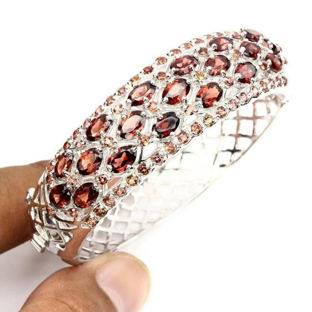 925 STERLING SILVER; PLATE -14K WHITE GOLD; MAIN STONE -MOZAMBIQUE GARNET; TOTAL WEIGHT -134.41 CT (TOTAL WEIGHT OF SILVER + STONE) DIMENSION * STONE 2.0 TO 7.0 X 5.0 MM. * DIAMETER 2.4 X 2.2 INCHES. * FACE BANGLE 57.0 X 17.0 MM.; MAIN STONE SHAPE- OVAL CUT; MAIN STONE COLOR -TOP RICH ORANGE; CLARITY/GRADE -IF TO VVS; TREATMENT UNHEATED ORIGIN -AFRICA; HARDNESS -7.0 - 7.5;