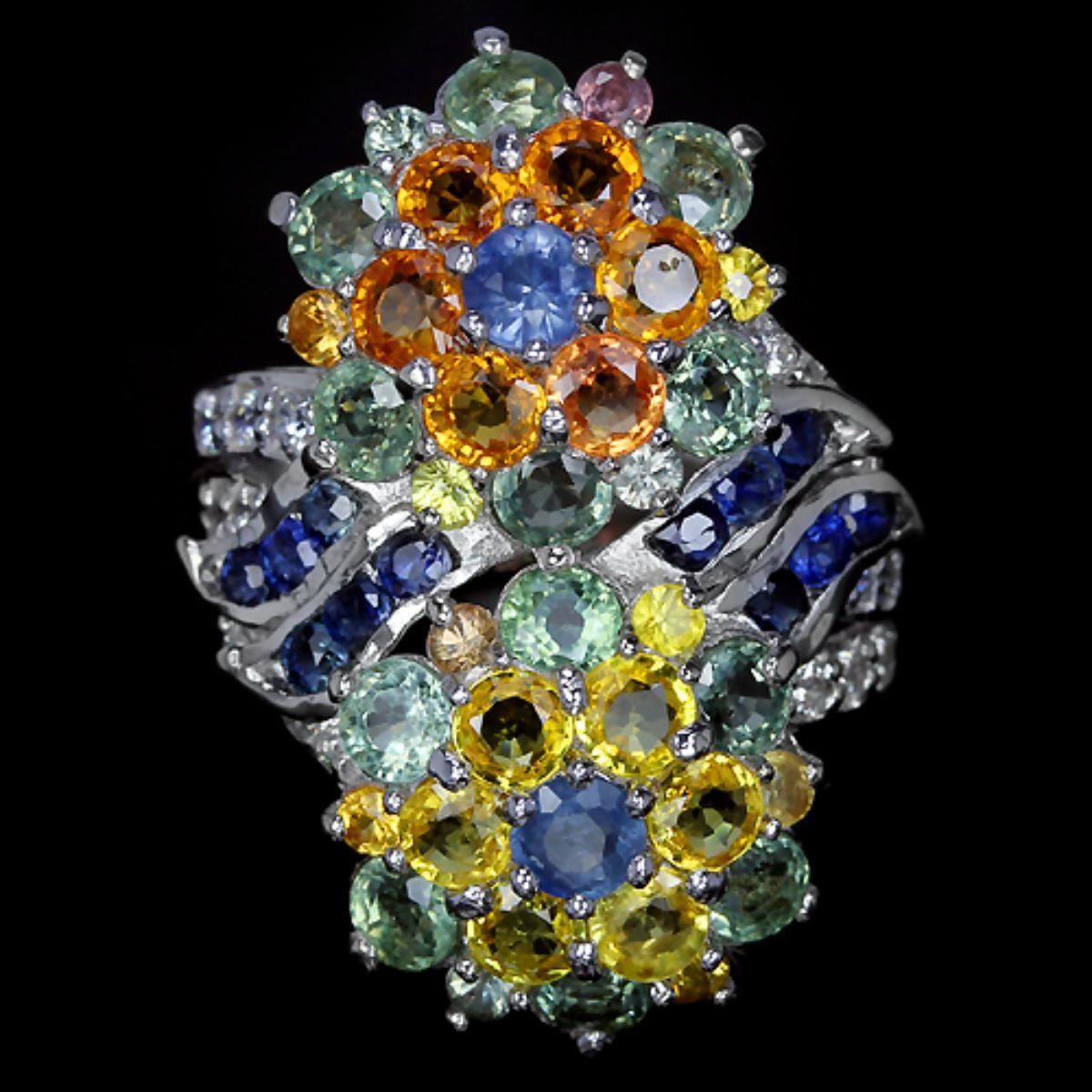 NATURAL MULTI COLOR SAPPHIRE CZ 925 SILVER RING 14K WHTIE GOLD COATING; RING SIZE -9.00 ( can be resized )[ ITEM QUANTITY 1; STONE SHAPE-ROUND FACET CUT;STONE DIMENSION 4 MM. , 3.5 MM. , 2.2 MM. , 2 MM. 1.2 MM.;MAIN STONE WEIGHT 8.85 CARAT;COLOR-MULTI COLOR; CLARITY VVS - VS;LUSTER DAZZLING';TREATMENT-HEATED;ORIGIN OF STONE AFRICA;HARDNESS 9.0;OTHER FACE OF RING 31 X 22 MM. ;WHITE CUBIC ZIRCONIA 1.7 MM. 1.5 MM. ;TOTAL 7.67 G.