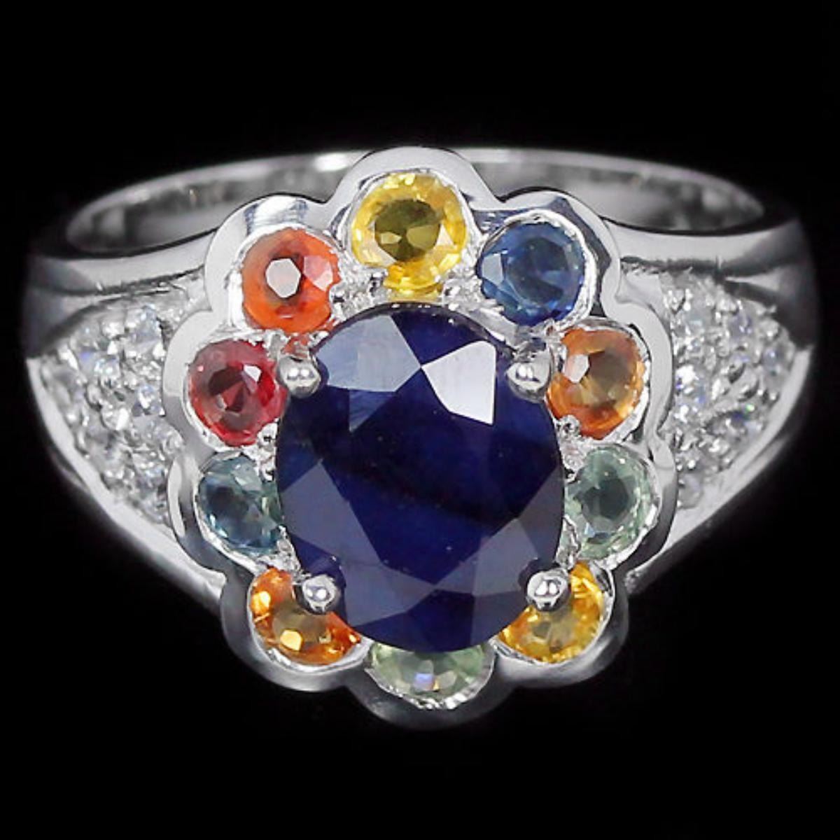 GENUINE MULTI COLOR SAPPHIRE WHITE CZ 925 SILVER RING 14K WHITE GOLD COATING...size 7; STONE SHAPE-OVAL FACET CUT;STONE DIMENSION9 X 7.1 X 4.9 MM.;MAIN STONE WEIGHT-3.75 CARAT;COLORBLUE;CLARITYTRANSLUCENT;LUSTERGORGEOUS;HARDNESS-9.0;OTHERFACE OF RING 19 X 15 MM.; SAPPHIRE 3 MM. ;WHITE CUBIC ZIRCONIA 1.7 MM. ;TOTAL 4.52 G.