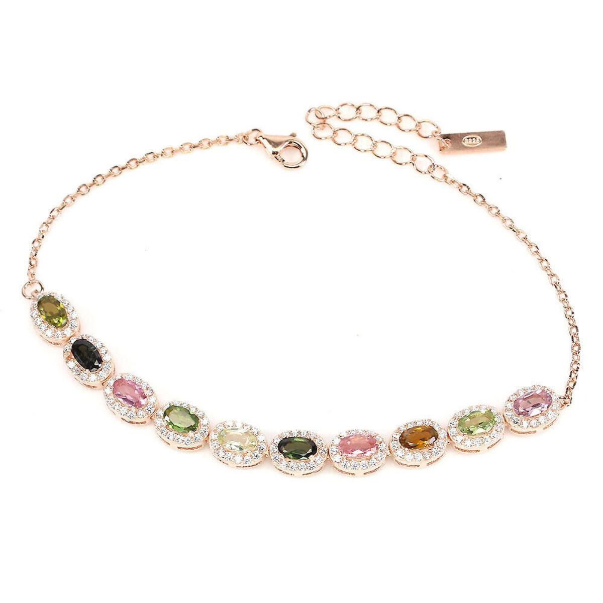 925 STERLING SILVER;PLATE-14K ROSE GOLD;LENGTH (INCHES)7;MAIN STONE-TOURMALINE;TOTAL WEIGHT-6.48 GRAM (TOTAL WEIGHT OF SILVER + STONE)DIMENSION-* STONE 5.0 X 3.0 MM. * CZ 1.0 MM. * TOTAL LENGTH 7.0 INCHES. * FACE BRACELET 75.0 X 6.0 MM.;MAIN STONE SHAPE-OVAL CUT;MAIN STONE COLOR-MULTI-COLOR;CLARITY/GRADE-IF TO VVS;TREATMENT-UNHEATED;ORIGIN-BRAZIL;HARDNESS-7.0-7.5;