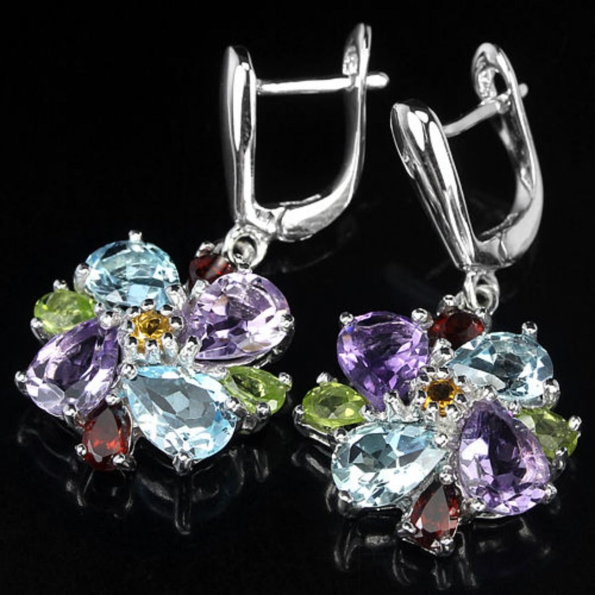 GENUINE TOPAZ AMETHYST GARNET CITRINE 925 SILVER EARRING 14K WHITE GOLD COATING; STONE SHAPEPEAR ROUNDSTONE DIMENSION8 X 6 MM. , 5 X 3 MM. , 3 MM.ITEM WEIGHT9.5 GRAMCOLORMULTI COLORCLARITYIF VVS TO VSLUSTERSPECTACULARTREATMENTIRRADIATION NATURAL UNHEATEDORIGIN OF STONEAFRICA,CAMBODIA,BRAZIL ASIAHARDNESS6.5 - 8OTHERFACE OF EARRING 35 X 18 MM.