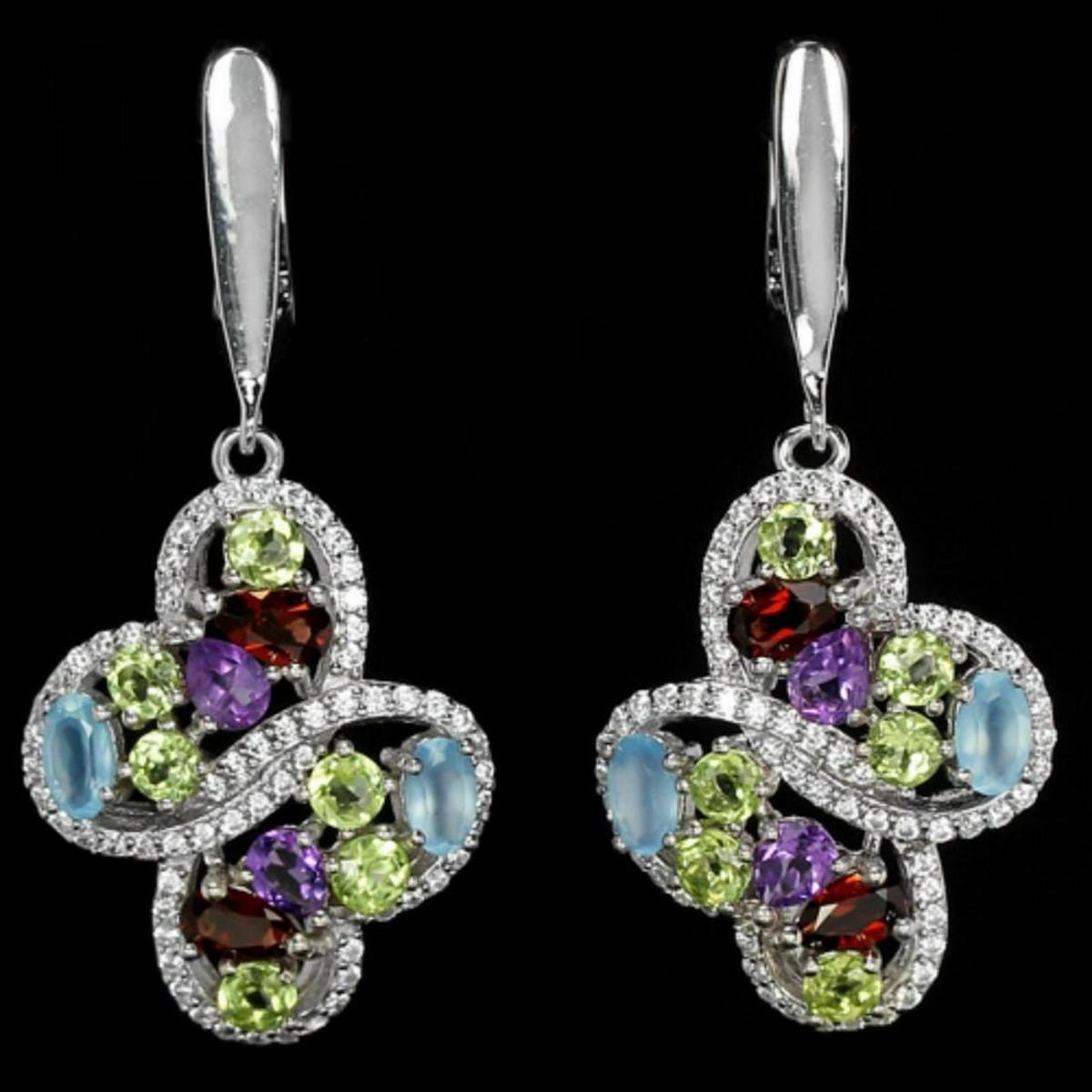 REAL CHALCEDONY GARNET AMETHYST PERIDOT 925SILVER EARRING 14K WHITE GOLD COATING; STONE SHAPEMIXED SHAPESTONE DIMENSION5 X 3 MM. , 4 X 3 MM. 3 MM.ITEM WEIGHT7.54 CARATCOLORMULTI COLORCLARITYIF-VVSTRANSLUCENTLUSTERALLURINGTREATMENTUNHEATEDORIGIN OF STONEAFRICA,CAMBODIA,BRAZIL ASIAHARDNESS6.5 - 8.0OTHERFACE OF EARRING 40 X 18 MM. WHITE CUBIC ZIRCONIA 1 MM. TOTAL 9.17 G.