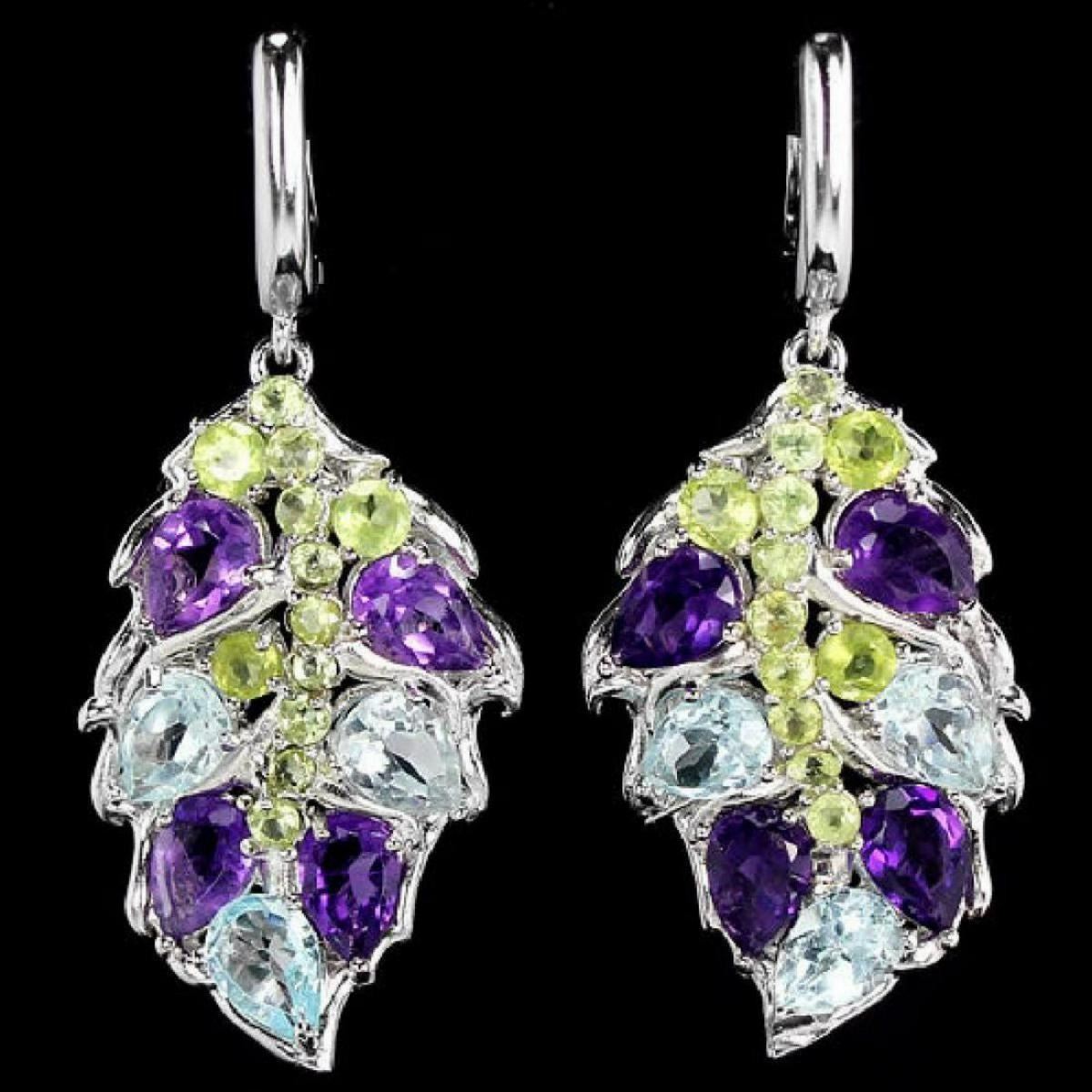 GENUINE MULTI COLOR AMETHYST PERIDOT 925 SILVER EARRING 14K WHITE GOLD COATING; STONE SHAPE PEAR & ROUND PORTUGUESE CUT STONE DIMENSIO 6 X 4 MM.MAIN STONE WEIGHT7.42 CARAT;COLORMULTI - COLOR CLARITY IF TO VVS LUSTER ENCHANTING TREATMENT NATURAL UNHEATED & IRRADIATION ORIGIN OF STONE BOLIVIA, ASIA & AFRICA HARDNESS6.5 - 8 OTHER FACE OF EARRING 40 X 17 MM. TOTAL 8.05 G.